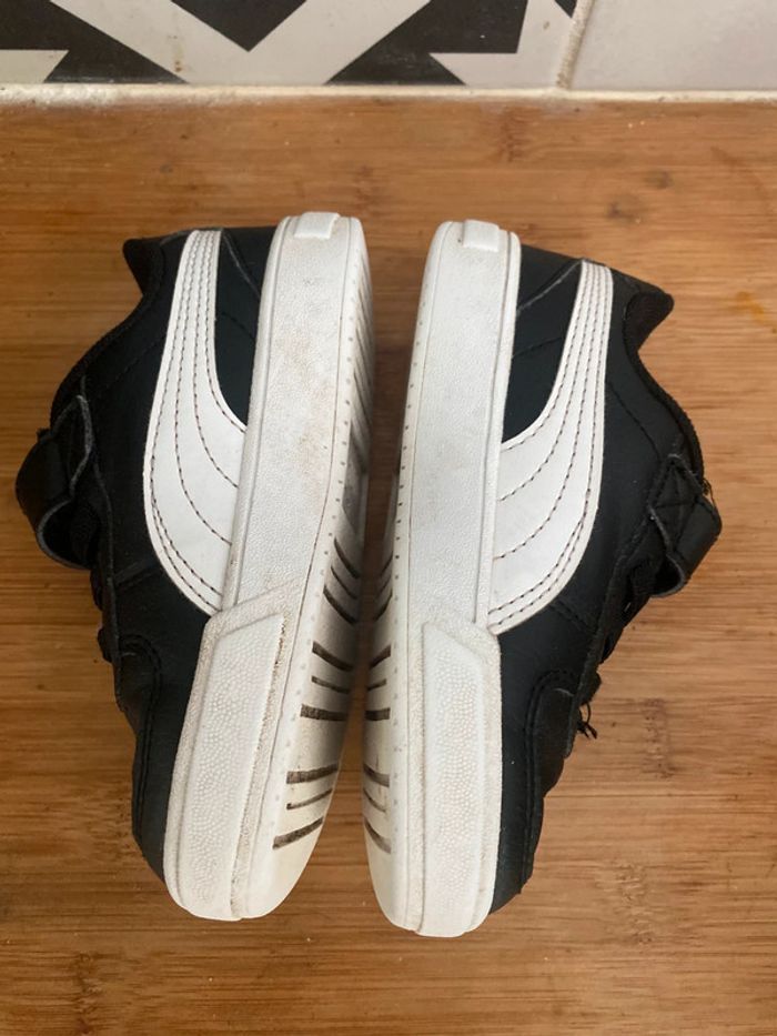 Quelques marques d’utilisation (hauteur de la semelle légèrement taché) Utilisées en parallèle de plusieurs autres paires de chaussure. Chaussures sans lacet donc utilisables à la crèche et l’école ;)