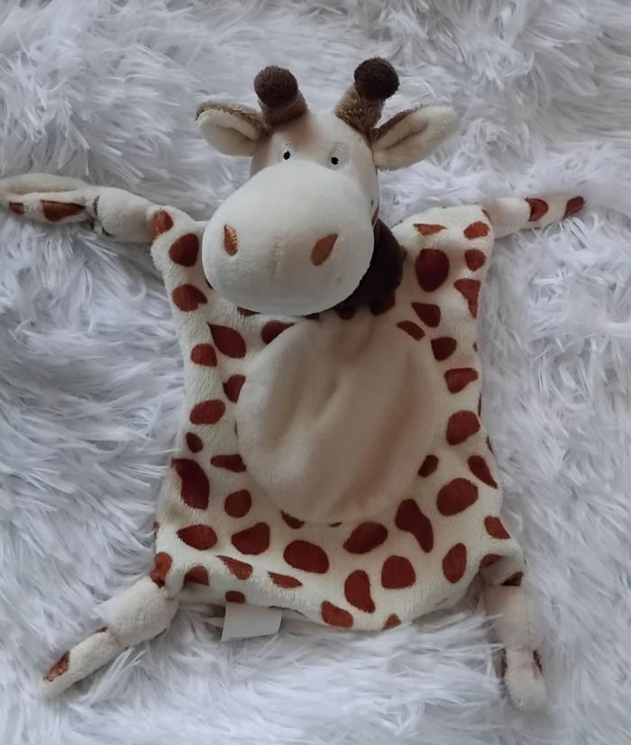 Doudou plat girafe en velours de couleur crème et tacheté. Foulard en velours de couleur marron autour de son cou. Nœud sur chaque coin du doudou.