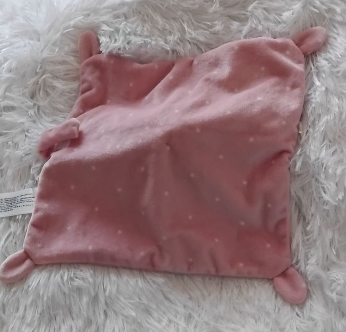 Doudou carré plat en velours de couleur rose avec étoiles de couleur blanches. Lapin gris sur le milieu du doudou. Attache tétine sur le côté du doudou.