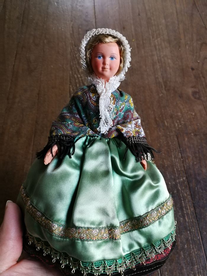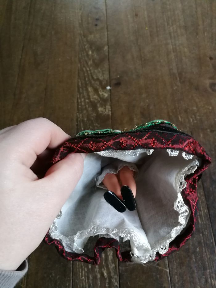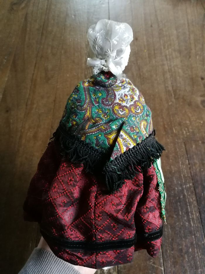 Poupée régionale de collection en robe rouge brodé et tablier vert, décoloré par le soleil, châle en coton à imprimé à franges noires, coiffe en dentelle blanche, jauni. Bon état général, ancienne poupée de collection. Taille : 20 cm Etat : B Ancienneté : 1970/1980 Habits : satin, organza, coton Matière : plastique/celluloïd