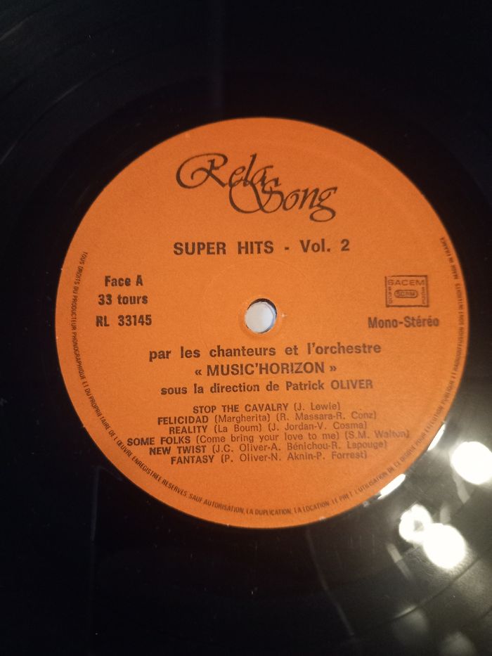 Disque vinyle 33 tours Artiste : music'horizon Titre : super hits volume 2 Face A 7 titres Face B 6 titres En bon état sans pochette
