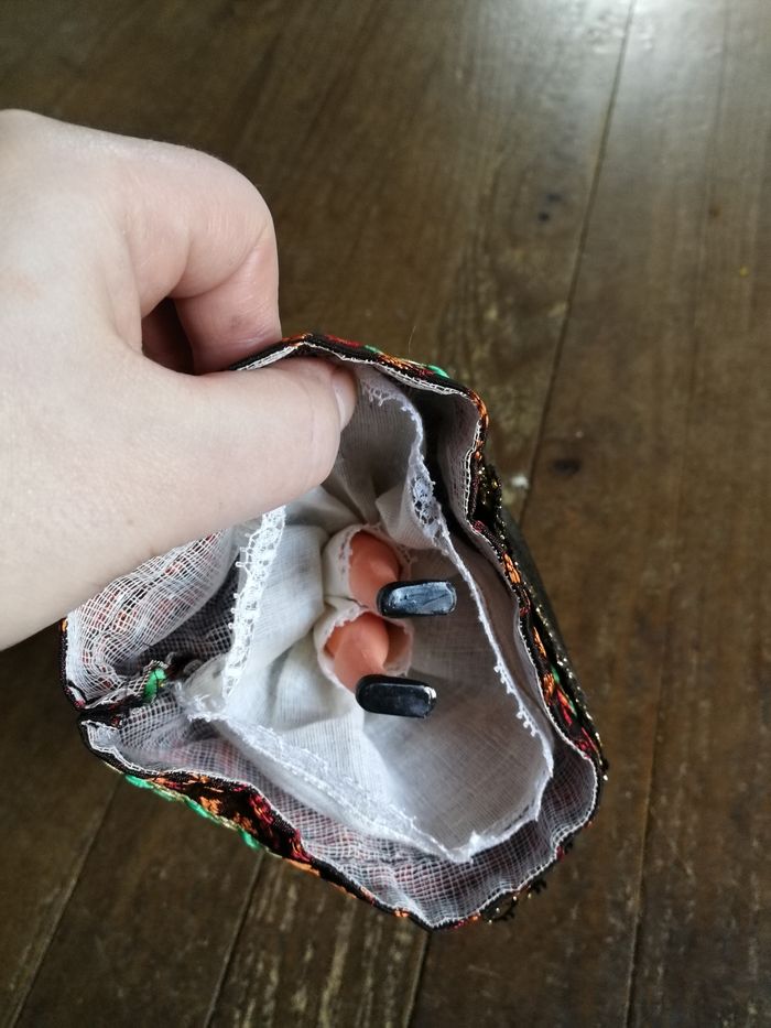 Belle mignonette de collection, en très bon état, ancienne, tablier noir satiné, robe noire en organza brodée de fleurs rouges et orange, châle en coton bord en dentelle, coiffe transparente dentelle. Taille : 12 cm Etat : TB Ancienneté : 1970/1980 Habits : dentelle, organza, coton Matière : plastique/celluloïd