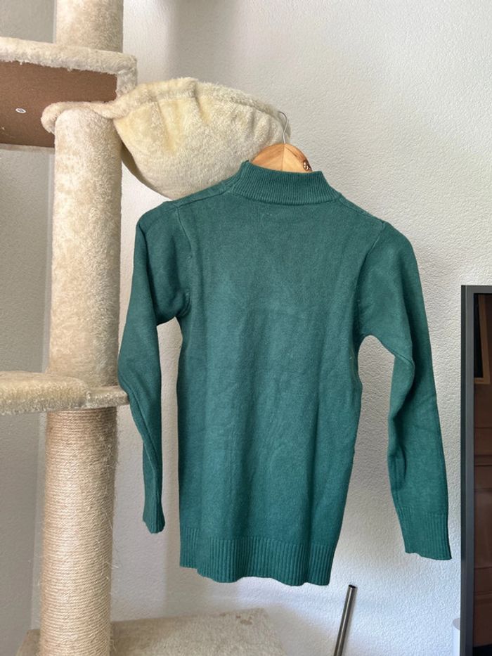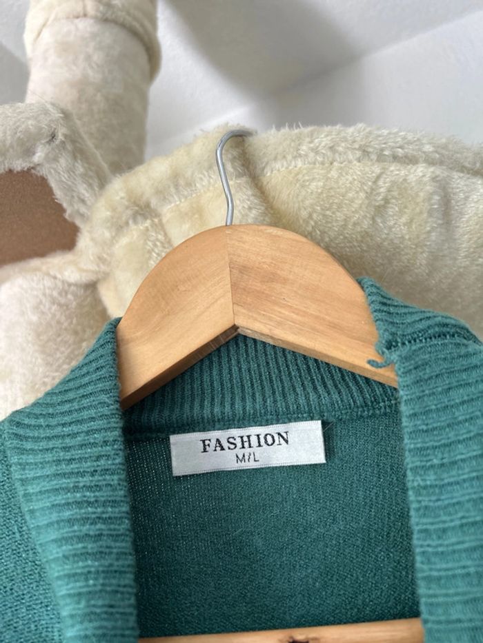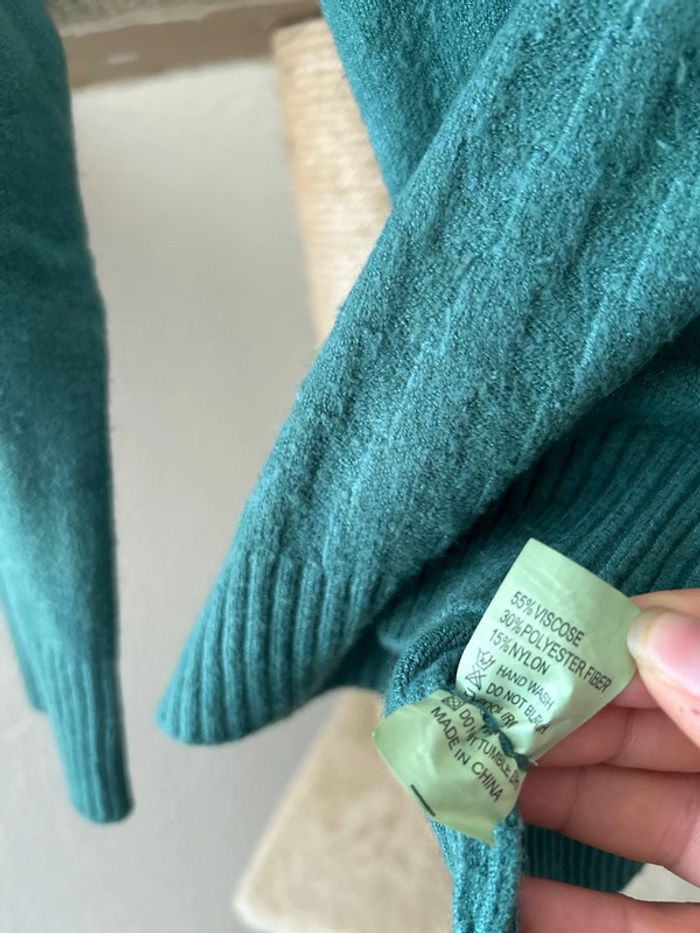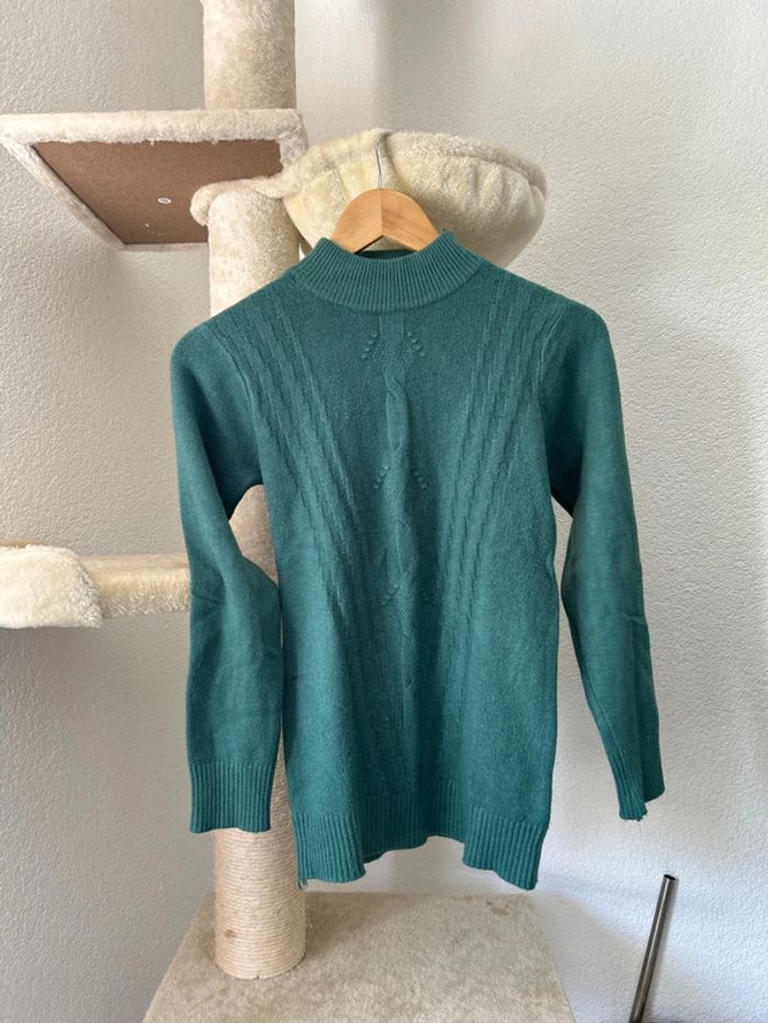 Joli pull vert en taille M/L Avec viscose, polyester et nylon Largeur aisselle à aisselle : 41 cm Longueur : 60 cm #delprincessetaillel #delprincessetaillem