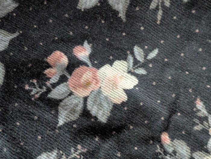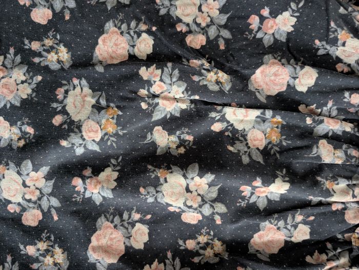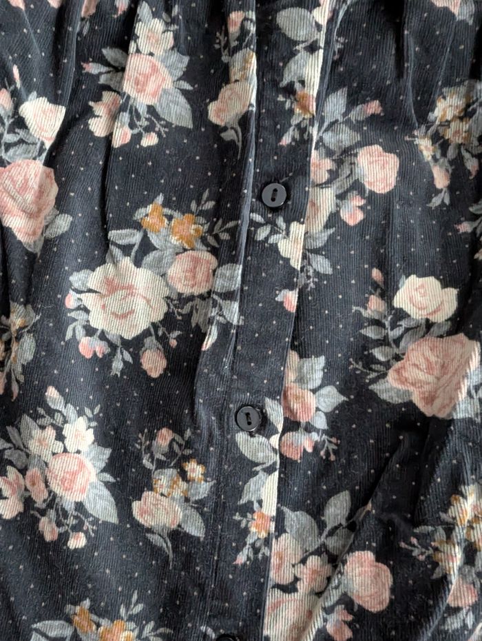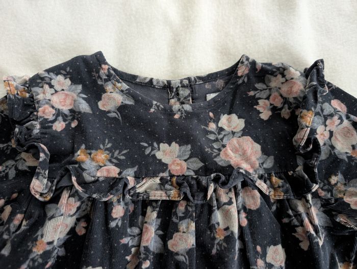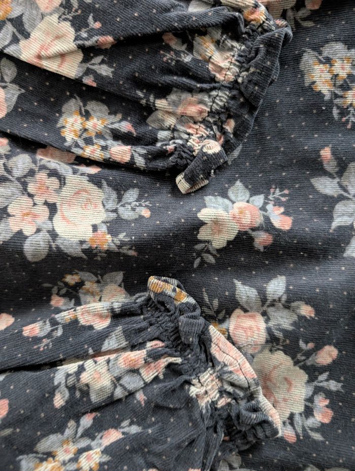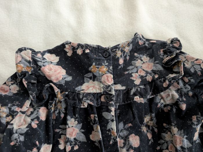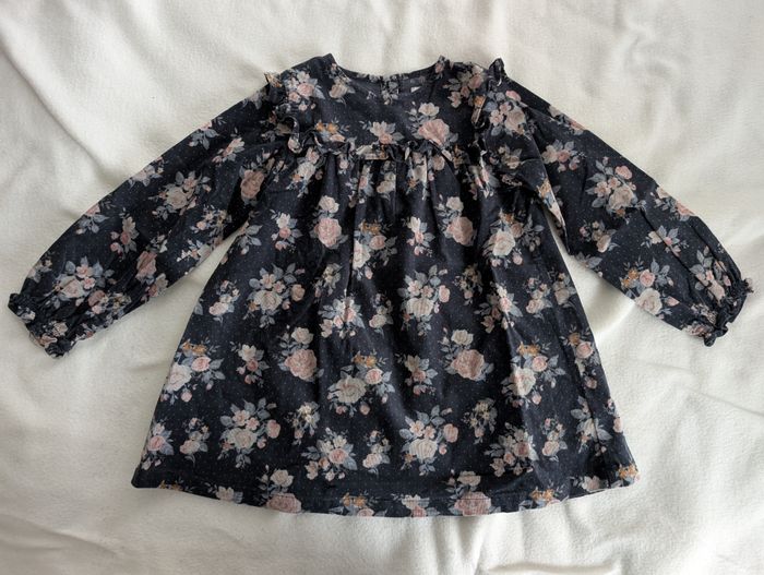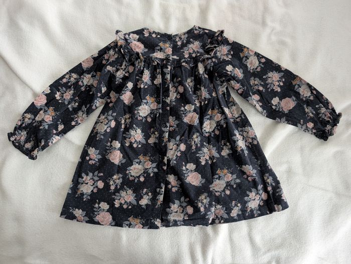 Robe velours bleue à fleurs 3 ans / 94 cm Vertbaudet Robe en velours côtelé fin : - bleu foncé à motif floral aux tons rose, beige, bleus et ocre et petits pois roses - volants froufrous aux épaules et à la poitrine - fronces sous la poitrine - bords des manches élastiqués et volantés - fermeture arrière à boutons coloris marine assorti - 98% coton et 2% élasthanne Très bon état, très peu portée