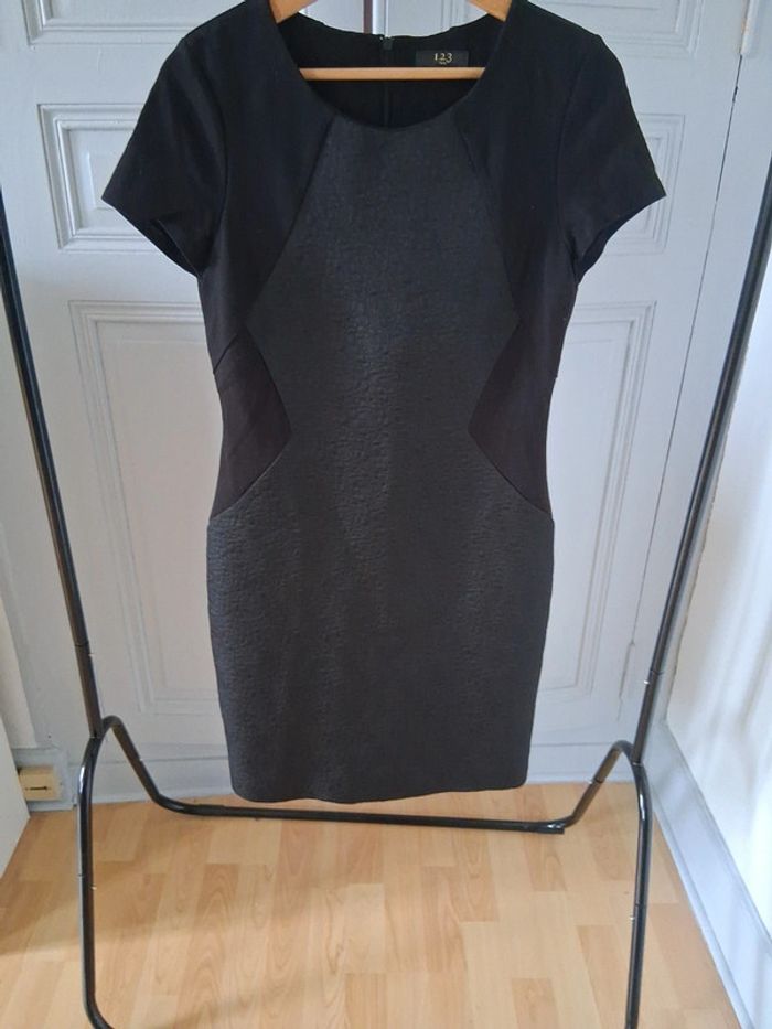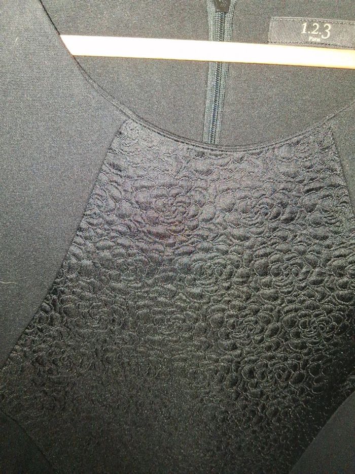 • Magnifique robe cintrée noire en bi matière, avec un effet fleurs brodée, manches courtes, fermeture éclaire dans le dos de marque 1.2.3 Paris