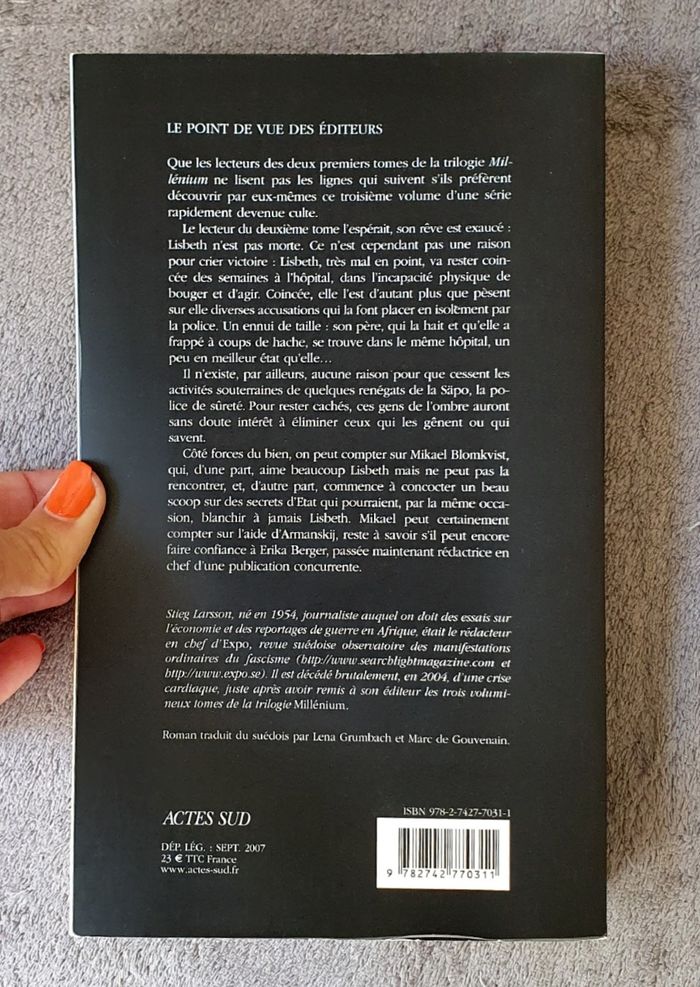 =) 3ème Tome de la Trilogie Millenium. Résumé : Que les lecteurs des deux premiers tomes de la trilogie «Millénium» ne lisent pas les lignes qui suivent s’ils préfèrent découvrir par eux-mêmes ce troisième volume d’une série rapidement devenue culte. Le lecteur du deuxième tome l’espérait, son rêve est exaucé : Lisbeth n’est pas morte. Ce n’est cependant pas une raison pour crier victoire : Lisbeth, très mal en point, va rester coincée des semaines à l’hôpital dans l’incapacité physique de bouger et d’agir. Coincée, elle l’est d’autant plus que pèsent sur elle diverses accusations qui la font placer en isolement par la police. Un ennui de taille : Son père qui la hait et qu’elle a frappé à coups de hâche se trouve dans le même hôpital, un peu en meilleur état qu’elle… Date de parution : Septembre 2007. Auteur : Stieg Larsson. Collection : Actes Noirs. Éditions : Actes Sud. =) 752 pages. Montant d'achat magasin : 23E. En très bon état général! Très légères traces d'usage (à peine visibles) sur couverture.