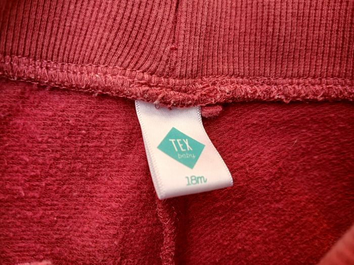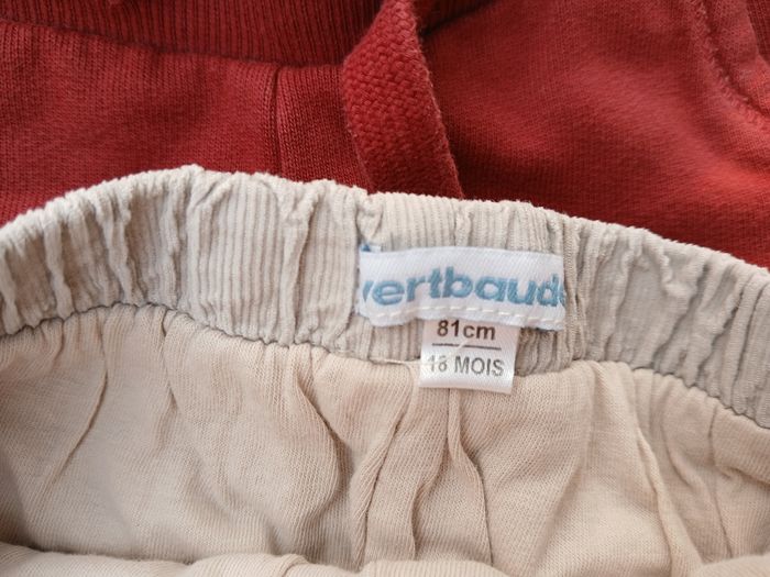 Lot de deux pantalons : - 1 en velours gris de la marque Vertbaudet, fausses poches en forme de coeur, très confortable. Taille 18mois / 81 cm. Bon état - 1 jogging rouge bordeaux de la marque Tex Baby, taille 18 mois. Bon état