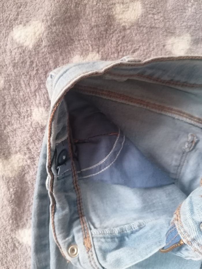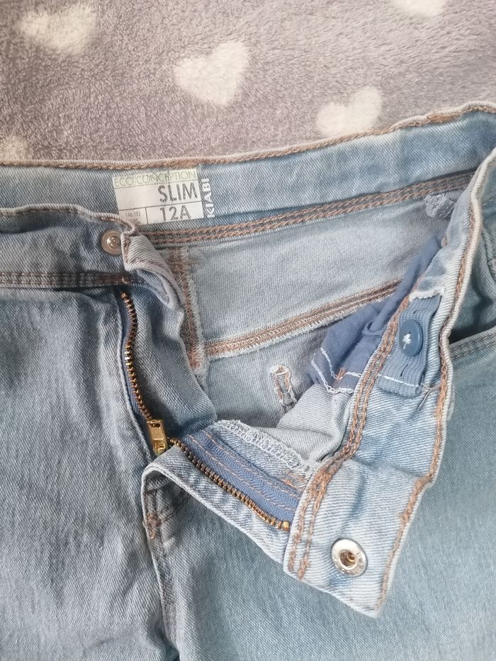 Pantalon jeans slim stretch 🩵 Kiabi écoconception bleu clair garçon 12 ans. Taille réglable par élastiques intérieurs. Fermeture éclair et bouton pression nickels. 2 poches avant et 2 poches arrières. Très bon état général, genoux nickels. Idéal à l'école et pour la rentrée. Mon fils ne peut plus mettre de coupe slim. Faites un lot, 10% de remise dès 5 articles achetés !! 🎶