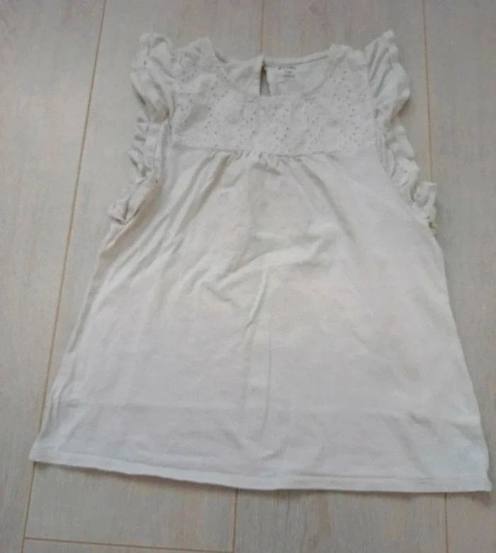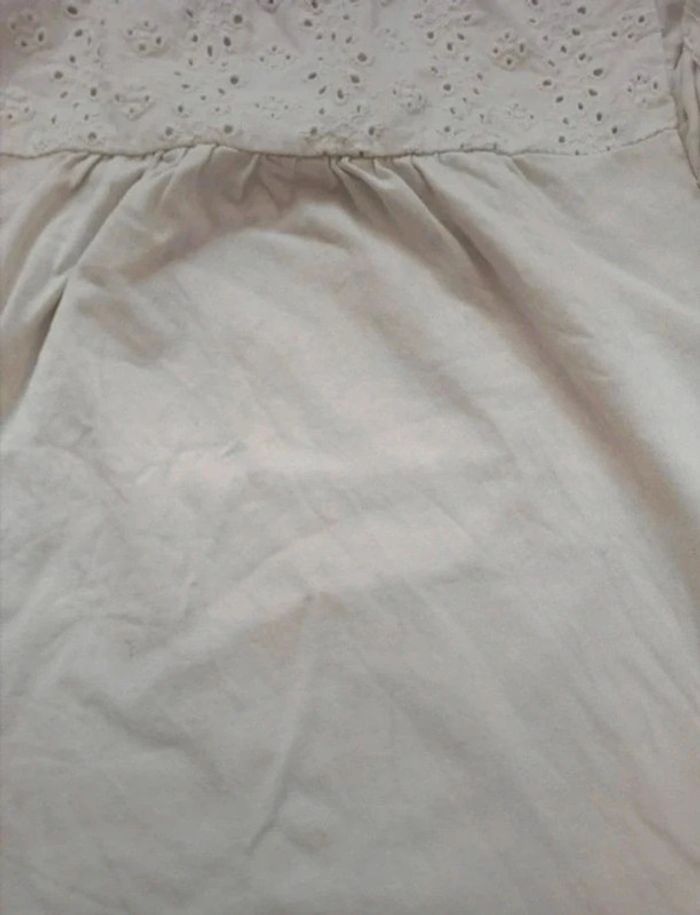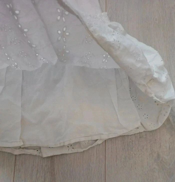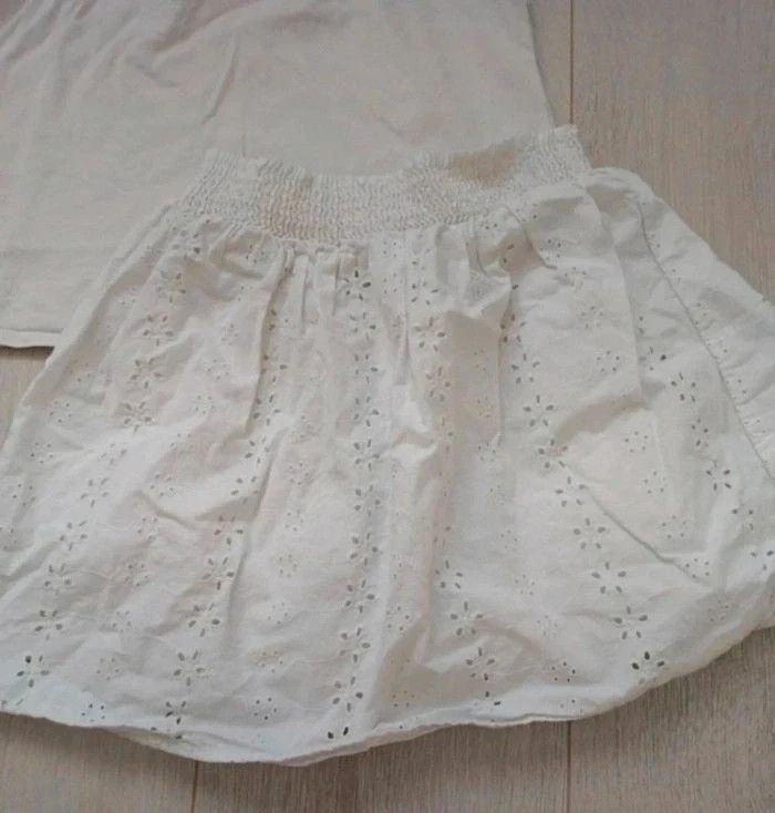 Ensemble Kiabi taille 10 ans. Composé d'un tee shirt blanc à col rond avec broderies anglaises et d'une jupe en popeline avec taille smockée. Le tee shirt est légèrement taché sur l'avant mais peu visible une fois porté. #ccj1367fille10ans ☑️ remises activées #kiabifille10ans #kiabiétéfille