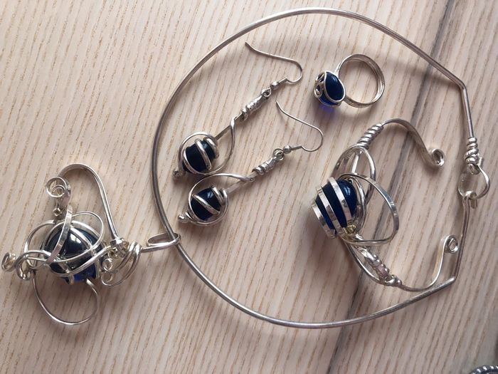 Parure collier, bracelet, boucles d'oreilles et bague avec pierres bleues