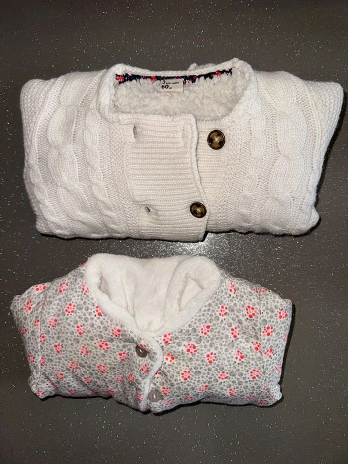 Lot de deux beaux gilets 3 mois en parfait état. - 1 gilet blanc avec torsades - tape à l’œil - 1 gilet réversible tout doux (1 face blanche tout doux et 1 face blanche avec point gris et rosé) - obaibi #jamaub3moisfille #lotvetement3moisfille #gilet3moisfille
