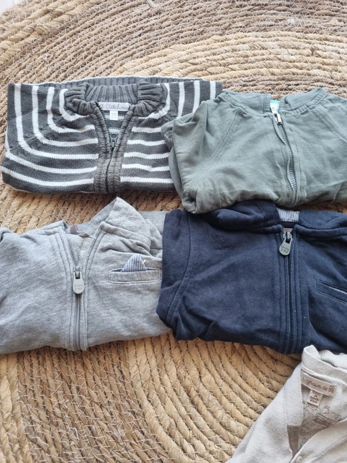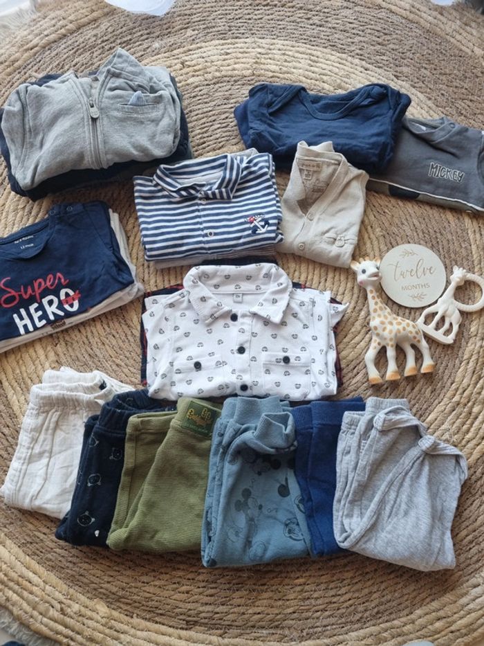 Lot bébé 12mois, 21 pieces Comprenant : 3vestes 1 gillet 1 sweats 2 combi légère 6 bas 2 chemise 1 pull sans manche 3 t-shirt manche longue 2 bodie manche longue Bon état général. Pas de trou ni de tache. Juste un t-shirt avec le chien tâche mais je ne les pas compter dans le lot, je le donne. Divers marques.