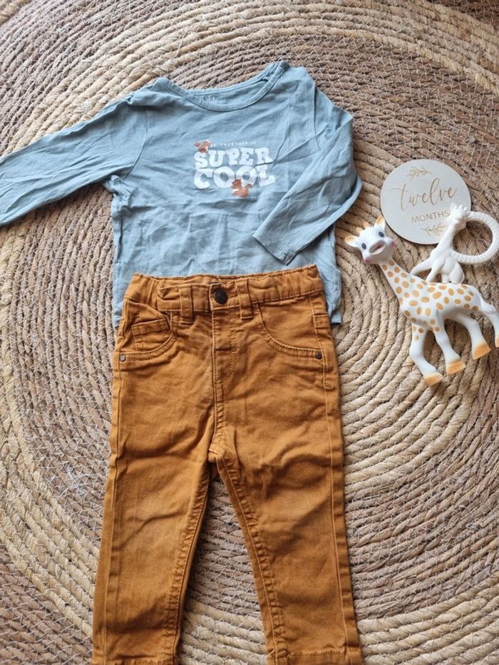 Ensemble kiabi 12mois. Jeans couleur camel et t-shirt manche longue vert menthe. Très bon état, pas de tache ni de trou. Maison non fumeur. ❌️Pas de VintedGo. Dressing rangé ⬇️ #Mathildeprunier10garcon_12mois #bebegarcon #bebe12mois