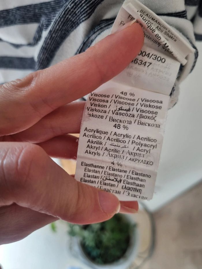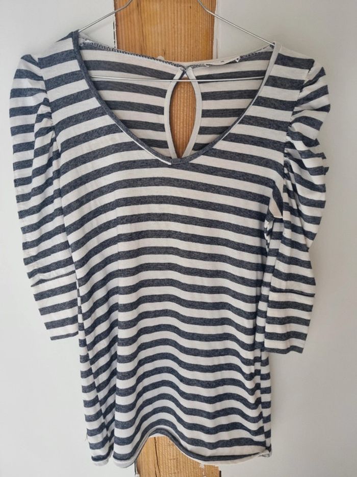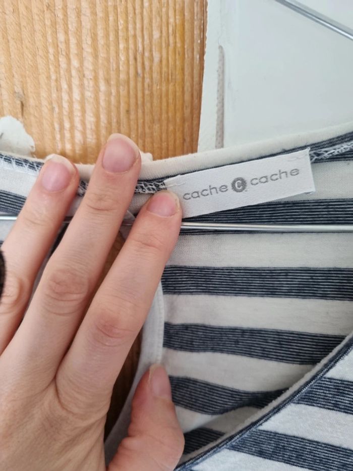 T-shirt manche longue cache-cache taille 38. Rayé blanc et marine. Manches bouffantes. Très bon état. Pas de trou ni de tache. Maison non fumeur. ❌️Pas de VintedGo. ⬇️Dressing rangé ⬇️ #Mathildeprunier10femme_taille_m