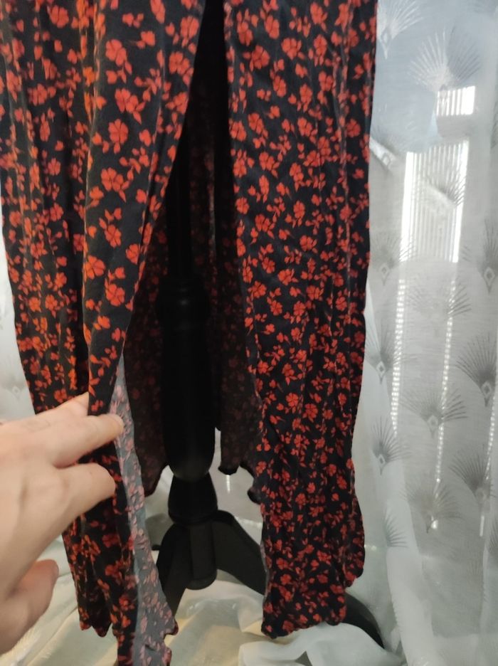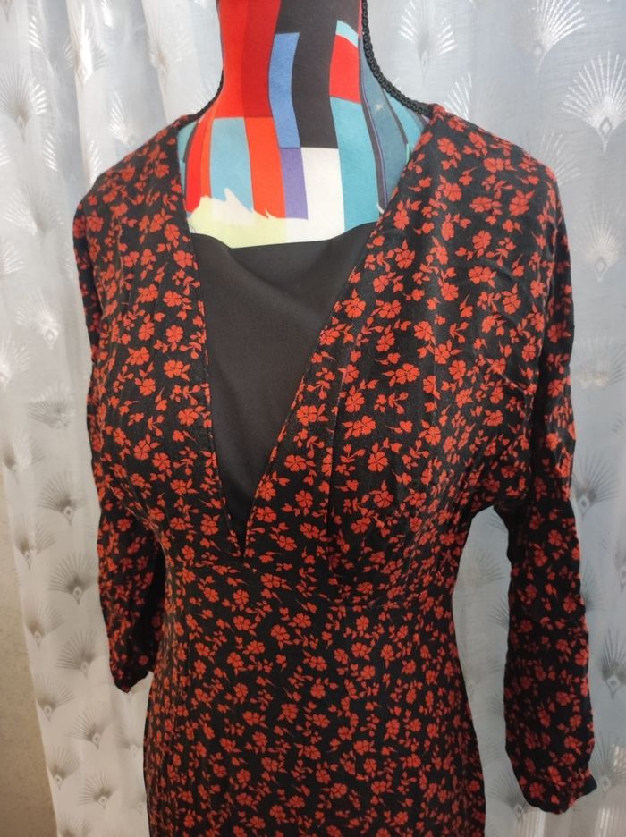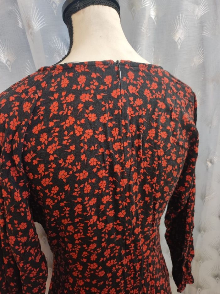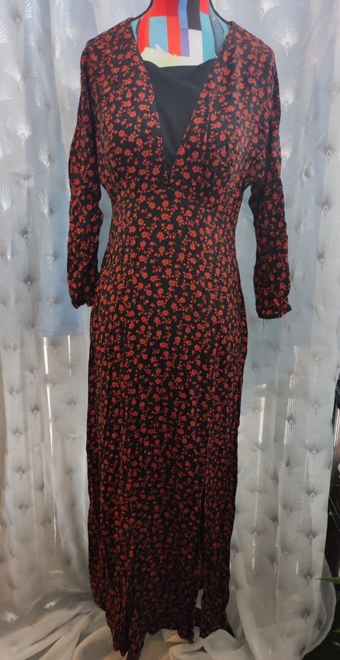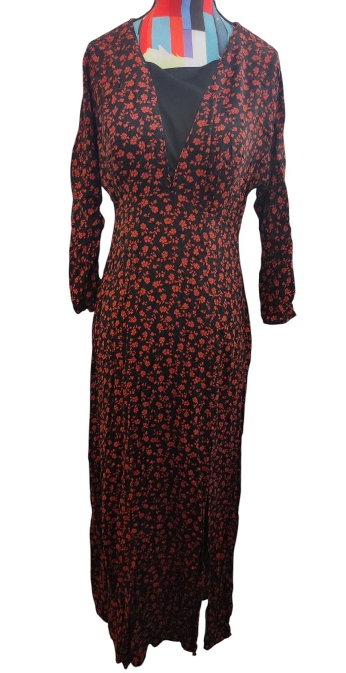 Robe longue et échancré sur le bas côté, demi manches et fermeture éclair a l'arrière. Fleurs rouges sur fond noire. De la marque stradivarius en taille L. Ni trou tâches ou déchirures, peu porter.