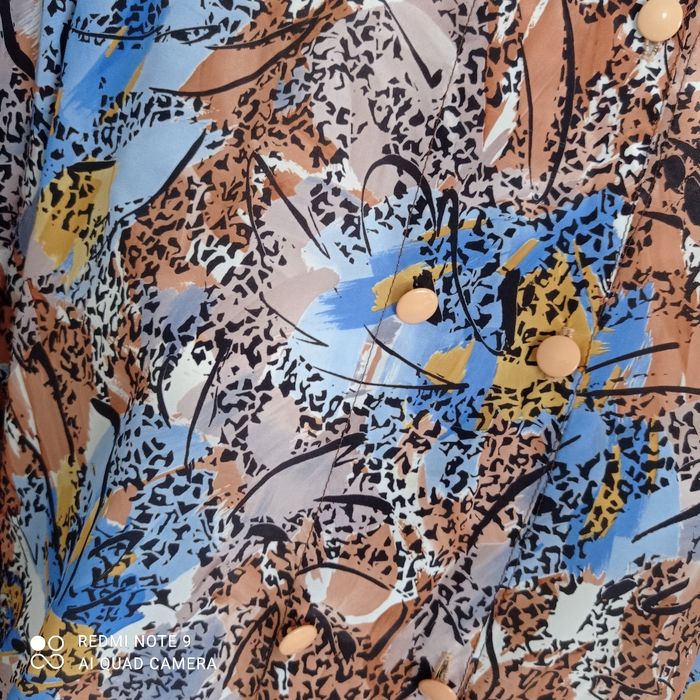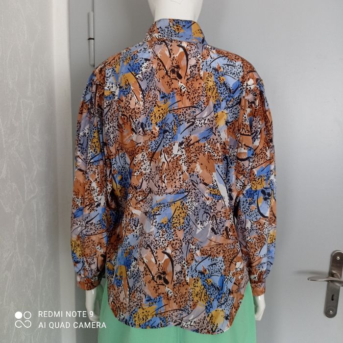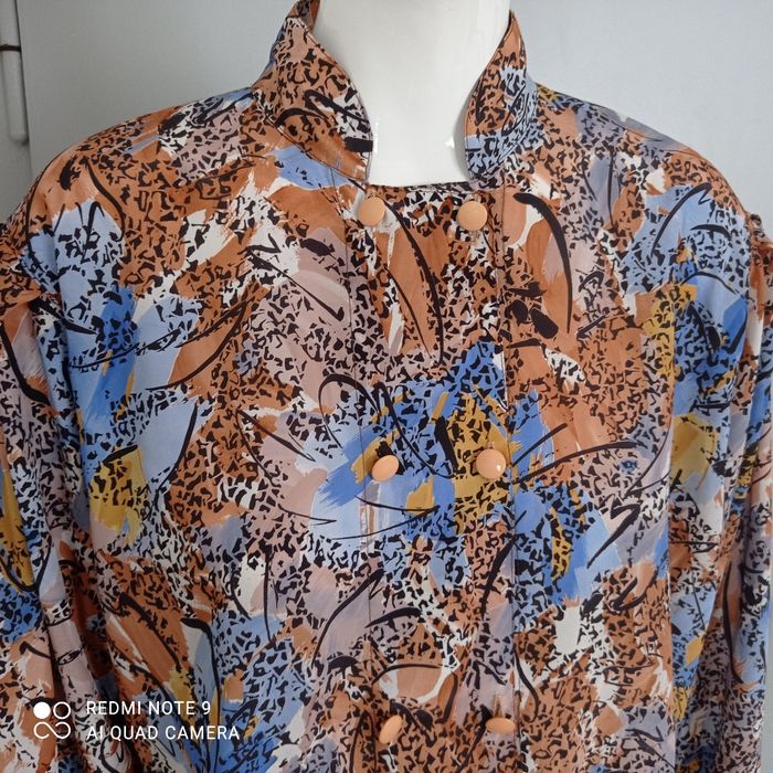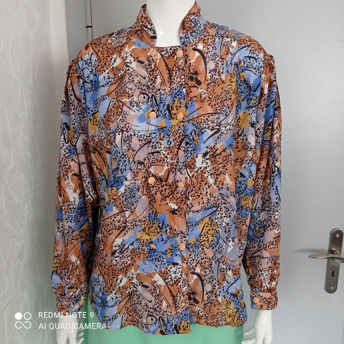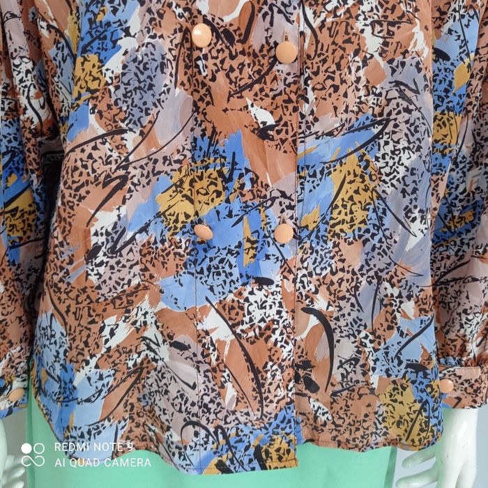 Polyester. Vintage. Quelques défauts aux poignets. Ne se voit pas porté. Mesures prises à plat : épaules : 42cm, aisselles : 45cm, longueur : 68cm. C17