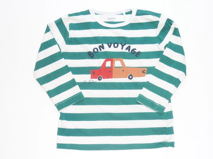 Pour voir mes annonces dans cette taille, tapez #karinelillegarcon2ans Haut Boutchou en très bon état, rayures de couleur verte sur fond blanc orné d'une animation.
