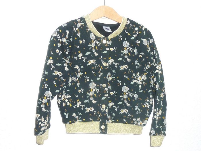Autres annonces dans cette taille: #karinelillefille5ans Veste molletonnée en état neuf de marque Petit Bateau, imprimé fleuri sur fond vert bouteille, liseré doré