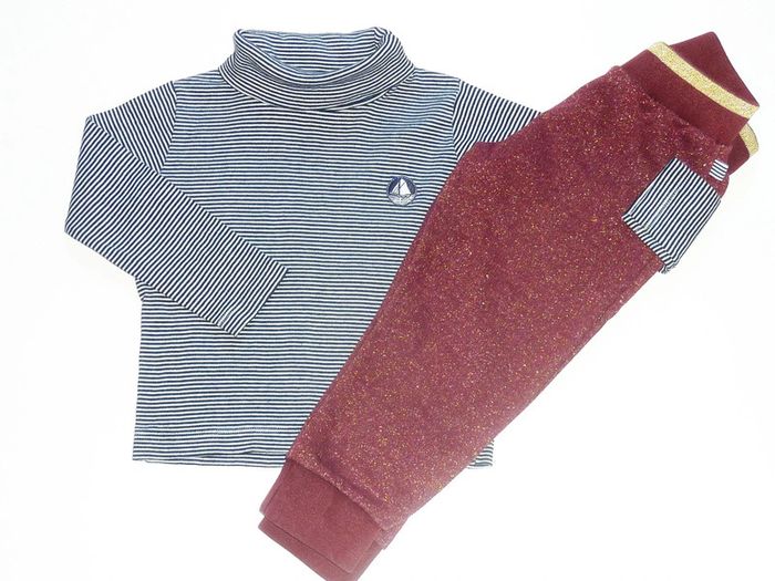 Autres annonces dans cette taille: #karinelillefille3ans #karinelillegarcon3ans Ensemble Petit Bateau en parfait état composé d'un pantalon en molleton bordeaux à pois dorés, ceinture élastique, associé au haut rayé marine et blanc à col montant