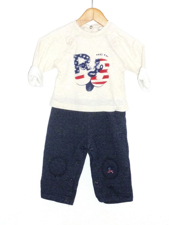 #karinelillegarcon6mois Combinaison doublée de marque 3 POMMES en excellent état, marine et beige chiné, fermeture par pressions à l'entrejambe. On aime son thème US. Dressing visible à côté de Montpellier