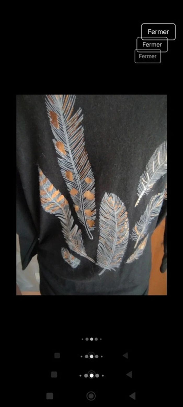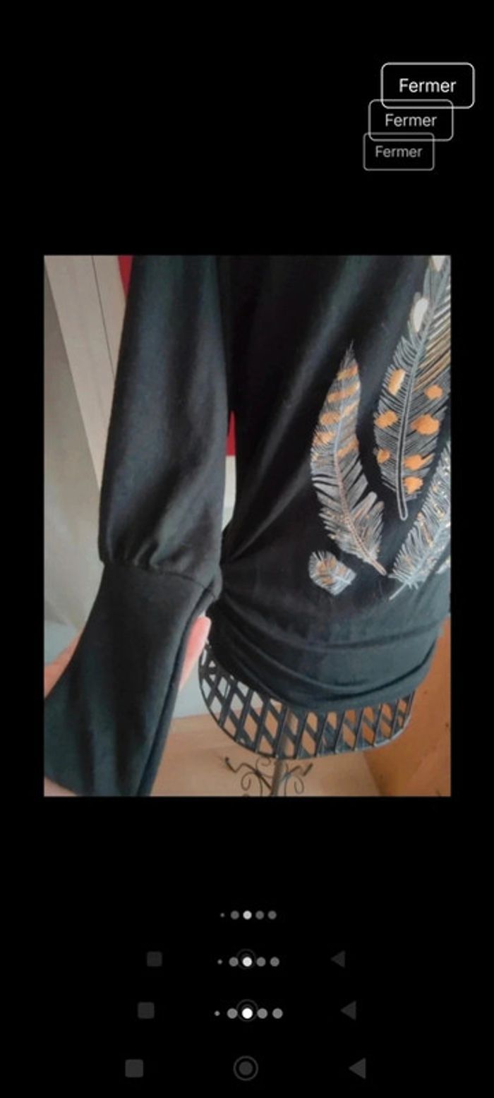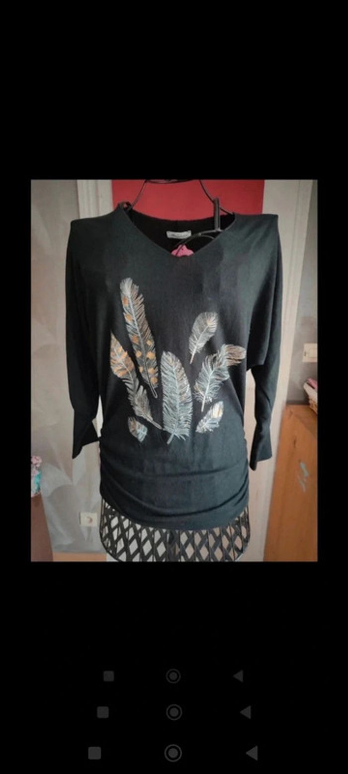 Pull noir Neuf motif plume avec touche de doré Manches resserrées au niveau des poignées Elastiques sur les côtés au niveau des hanches New collection taille unique