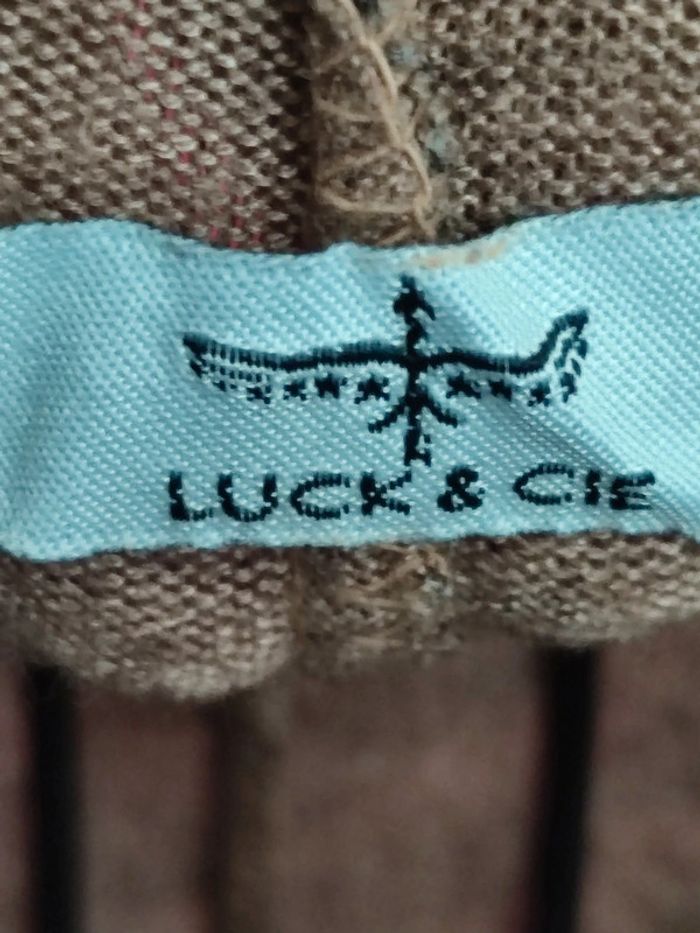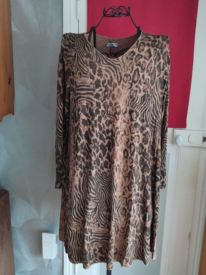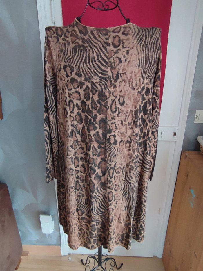 Robe marron longueur genou motif léopard. Longueur 95 cm Aisselles à aisselles : 55 cm tissu extensible jusqu'à 71 cm 30 % viscose 35 % laine 35% angora Luck et cie taille unique