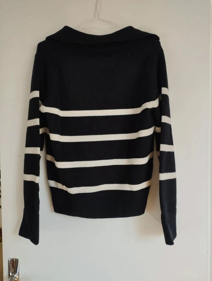 Pull marin noir et blanc en maille fine. Coupe droite. Col polo Toujours en vente sur le site de la marque 50% VISCOSE. 28% POLYESTER. 22% POLYAMIDE. (étiquette de composition coupée) Porté 1 fois Mango taille S