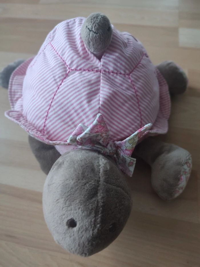 Peluche tortue JACADI d'activités Promenade au parc Dimensions : longueur 35 cm environ  La peluche tortue se pare d'un empiècement Liberty et de rayures.  Surprises cachées à l'intérieur de sa carapace : mini-tortue hochet grelot