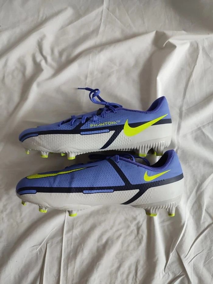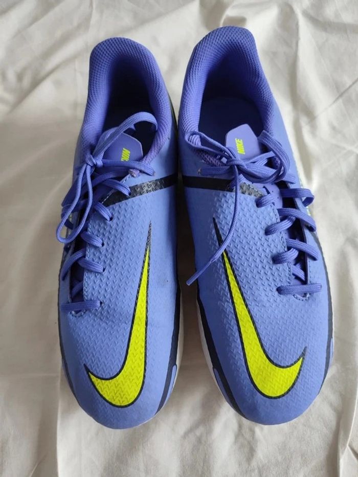 chaussure de foot bleu violet et jaune fluo modèle: plantom GT Acadey Fgmg junior peu portée valeur 79 euros nike taille 38 1/2