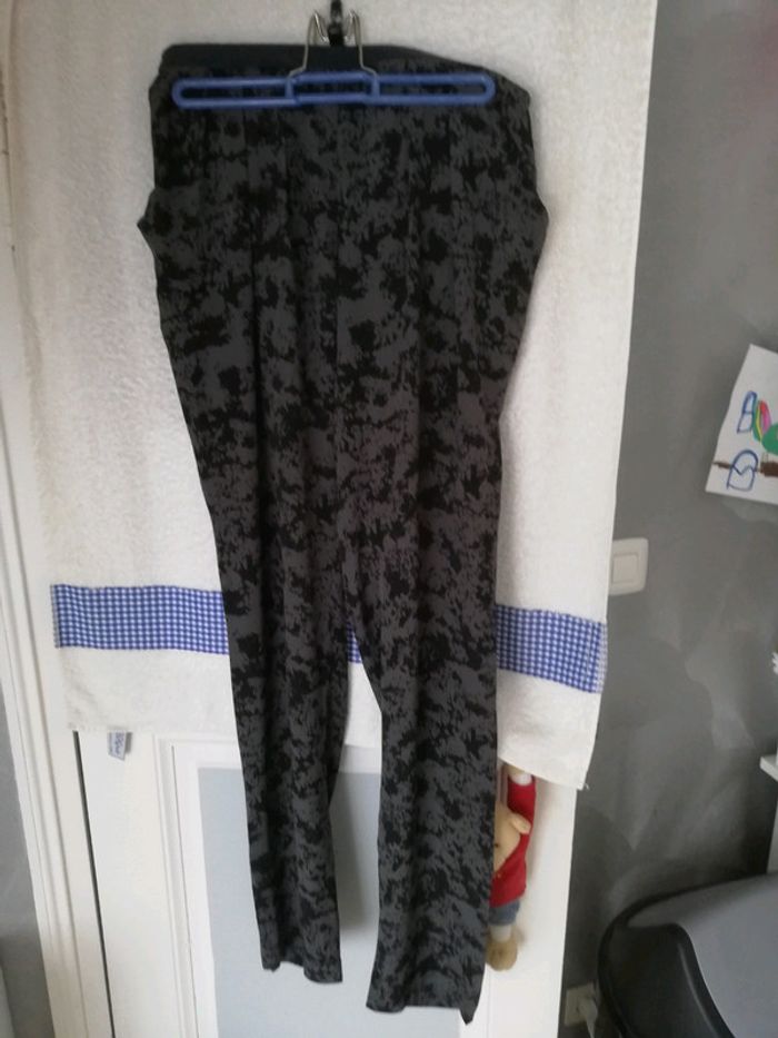 Pantalon moucheté noir et gris ceinture cuir lavable. Fermeture dans le dos. 2 poches Viscose