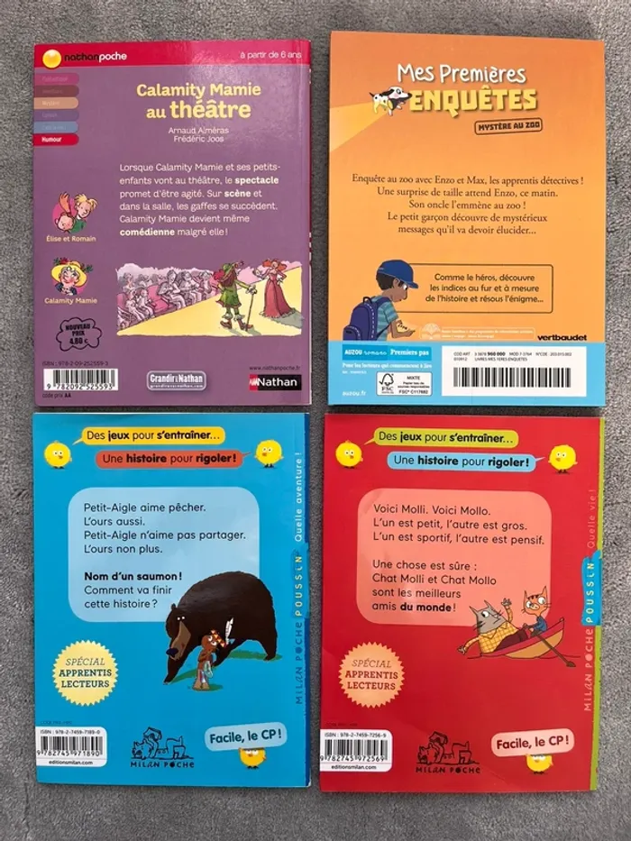 Lot de 4 livres en excellent état - Chat Molli et Chat Mollo - La pêche à l’ours - Calamity mamie au théâtre - Mes premières enquêtes - mystère au zoo Pour voir mes autres livres pour enfants : #felaxdalivreenfant