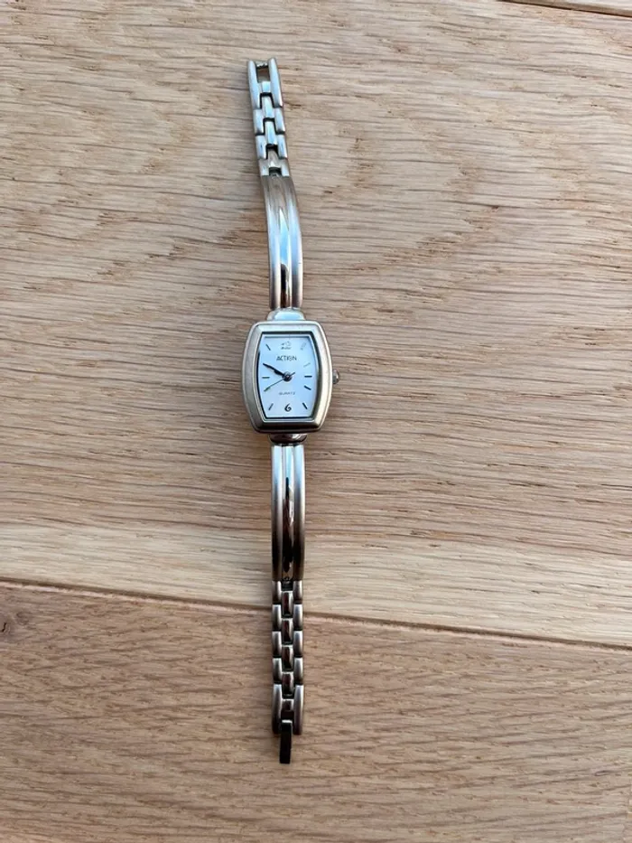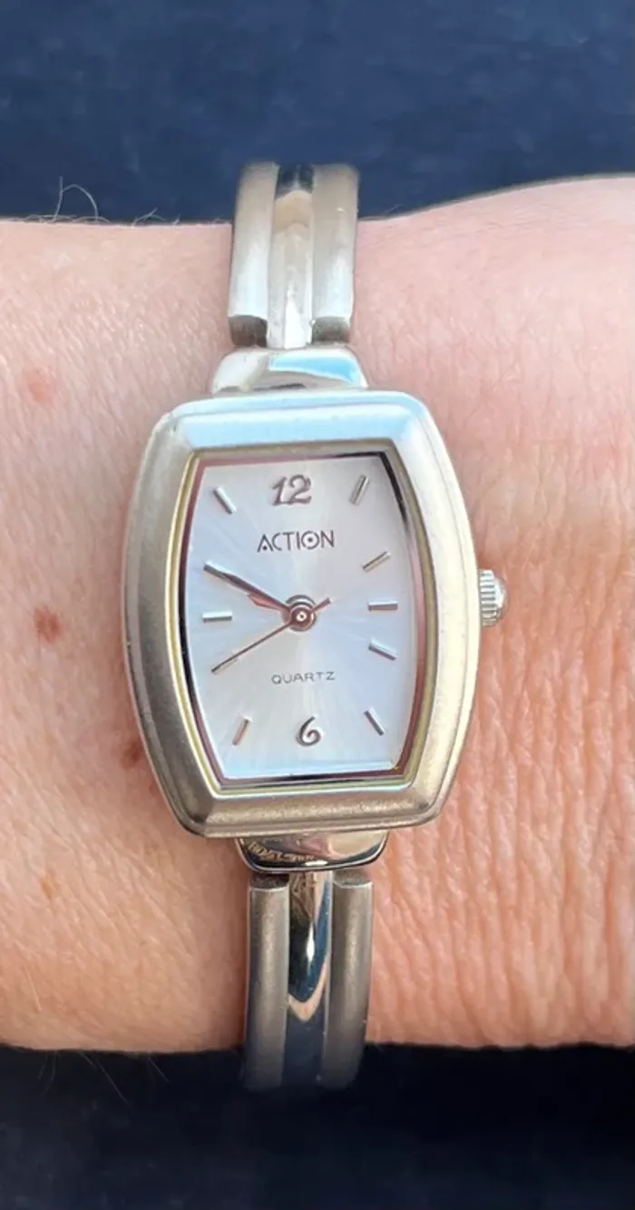 Montre pour poignet très fin (mon poignet fait 16,5 cm et elle est serré) État impeccable, je ne me souviens pas l’avoir portée Pile à changer (Ne vient pas des magasins Action 😉)