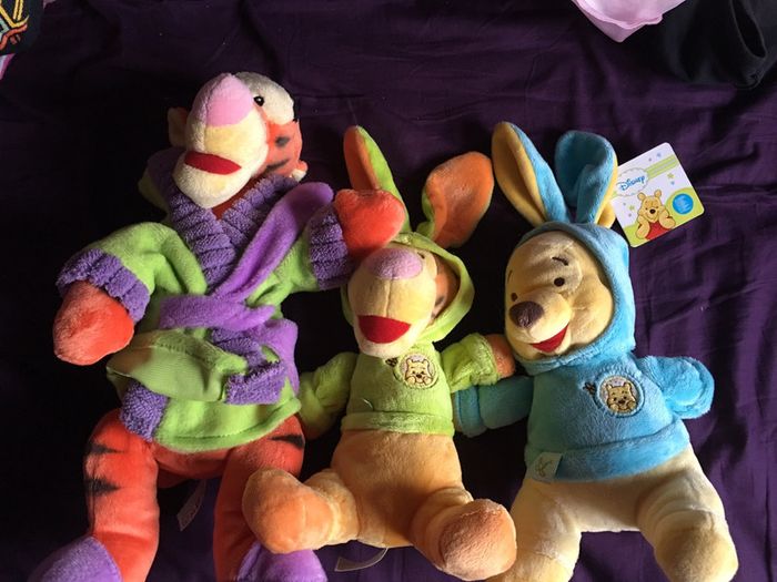 Winnie est neuf avec étiquette. les deux tigrou n’ont pas leurs étiquettes mais n’ont pas été donnés à un enfant et sont donc neufs sans étiquette.