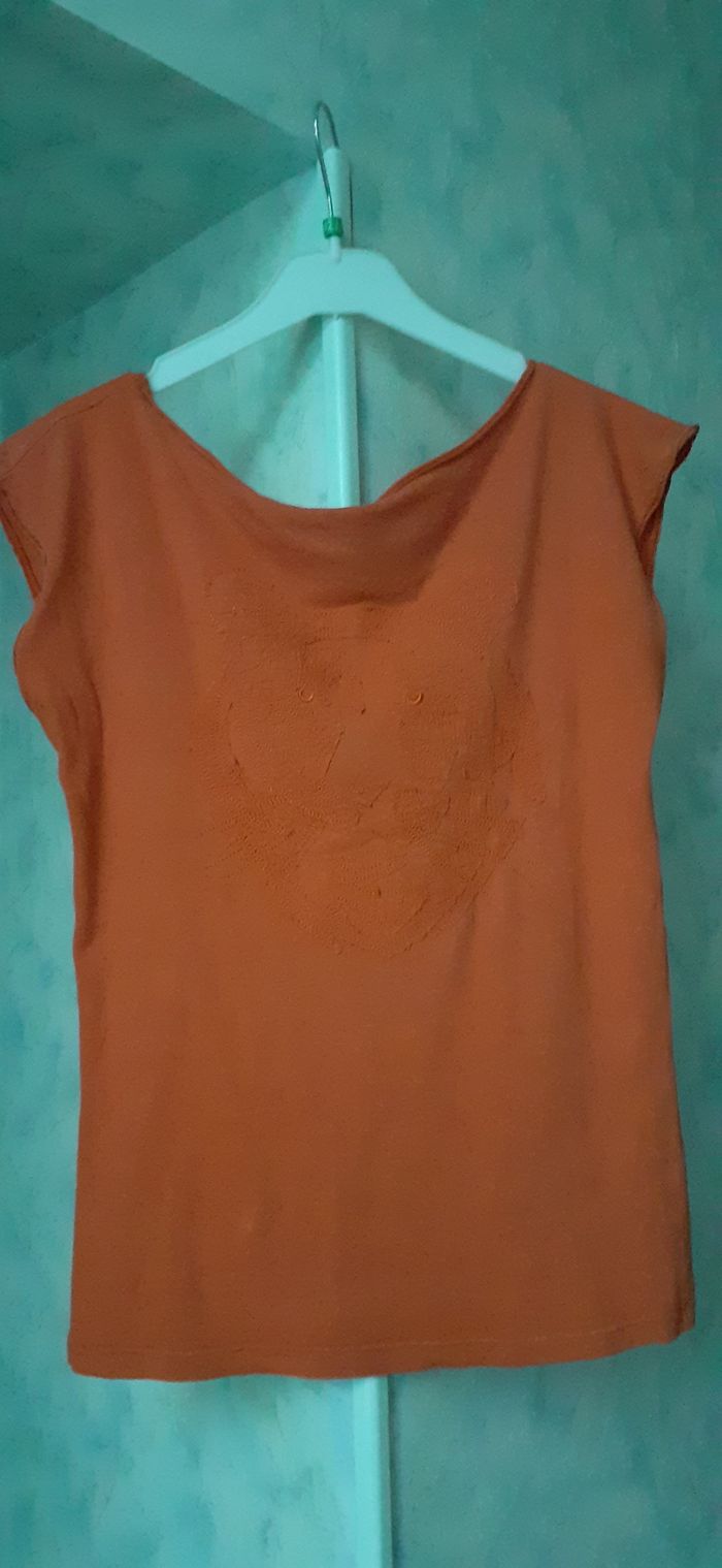 Vends un tee-shirt sans manche en coton et viscose, très doux au toucher, couleur orange avec une tête de lion brodée dans le dos, marque Undiz, taille M sur l'étiquette mais peut convenir à une taille 36. Longueur de l'épaule à la base : 56 cm Largeur aisselle à aisselle : 42 cm.