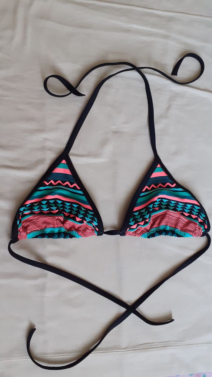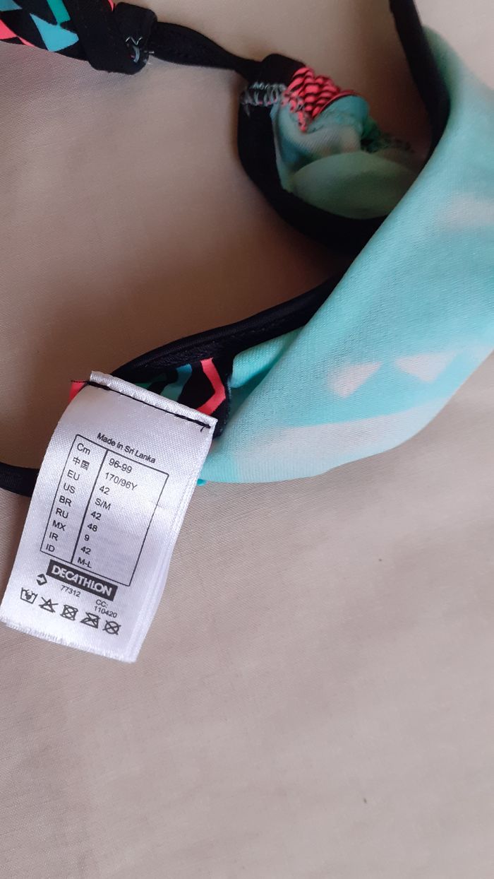 Vends un haut de maillot de bain à liens, couleurs vives et bordures noires, marque Décathlon, taille 42 EU.