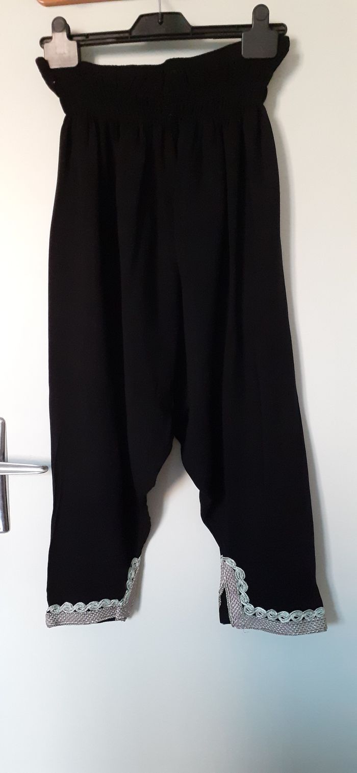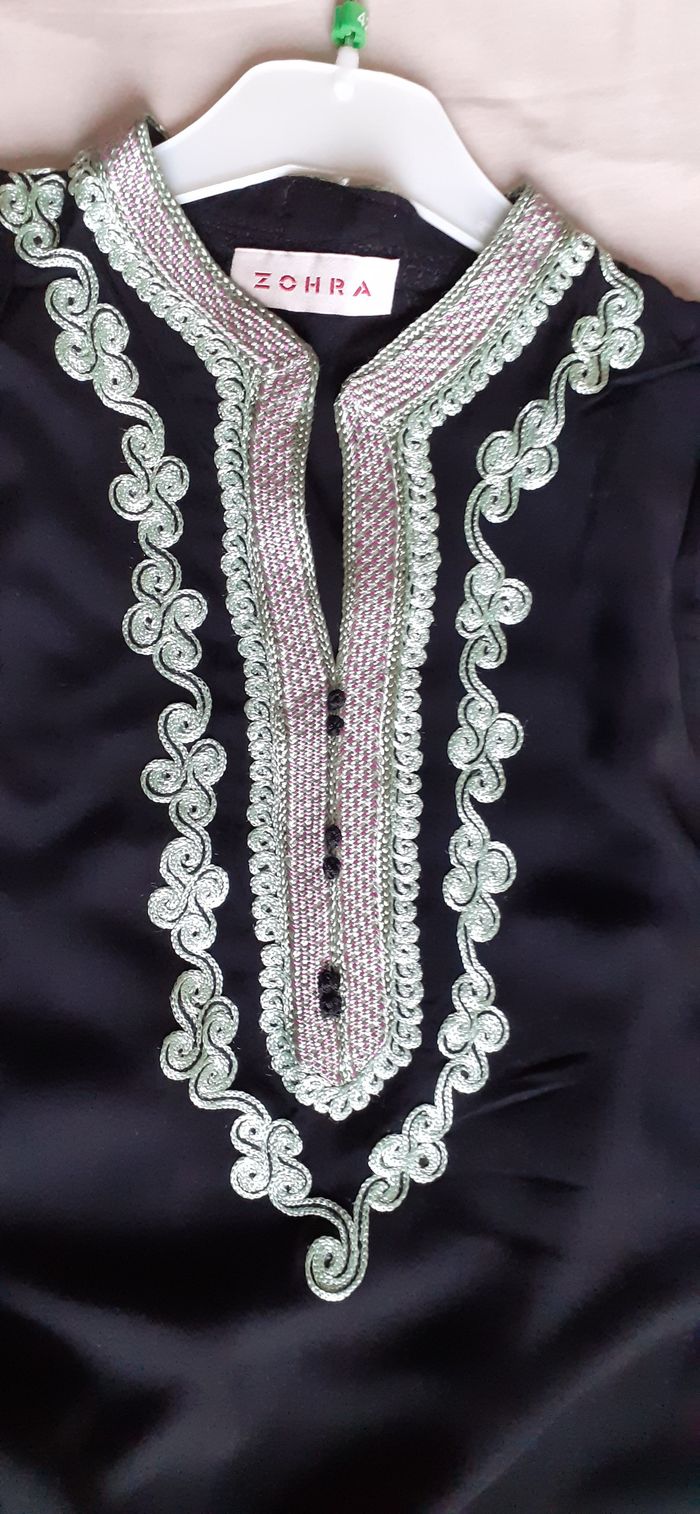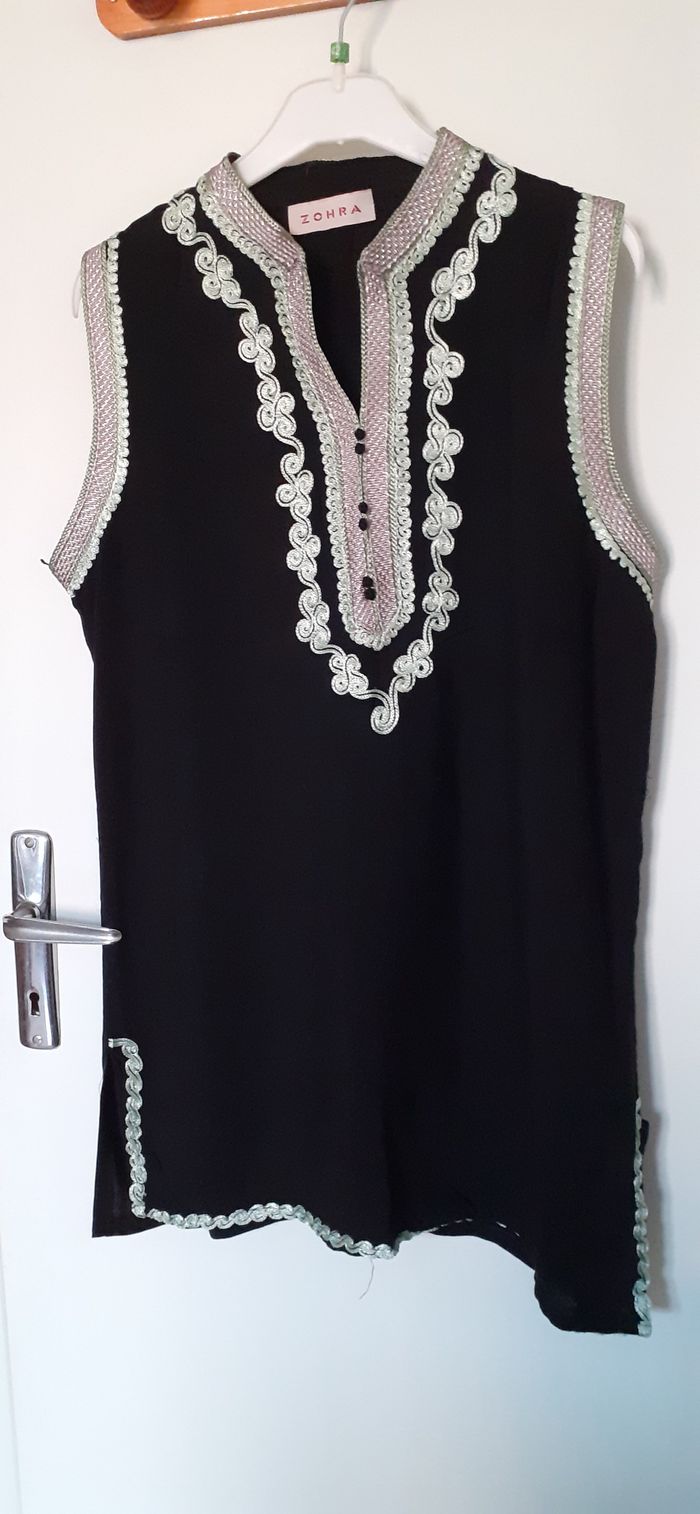 Vends un ensemble en viscose un peu épais composé d'une tunique sans manche et d'un sarouel assorti, couleur noir avec broderies vert clair satinées, neuve, marque Zohra (Tunisie), taille 40. Longueur de la tunique dans le dos : 75 cm Largeur aisselle à aisselle : 49 cm Largeur au niveau des hanches : 50 cm Longueur du sarouel sur le côté : 78 cm