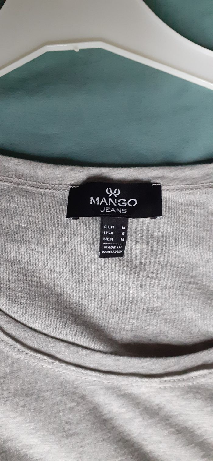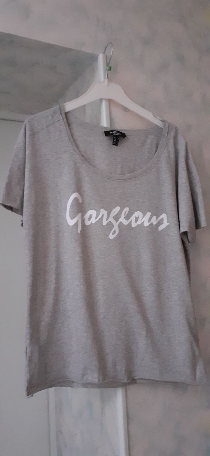 Vends un tee-shirt manches courtes, 100 % coton fin et doux, sans ourlet à la base et aux manches, couleur gris clair avec inscriptions blanches devant, marque Mango, taille M EUR 38-40. Longueur de l'épaule à la base : 63 cm Largeur aisselle à aisselle : 50 cm.