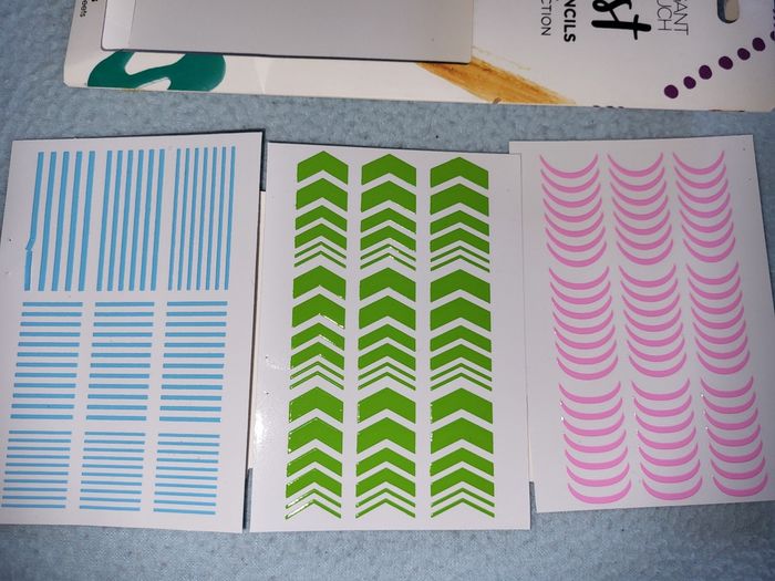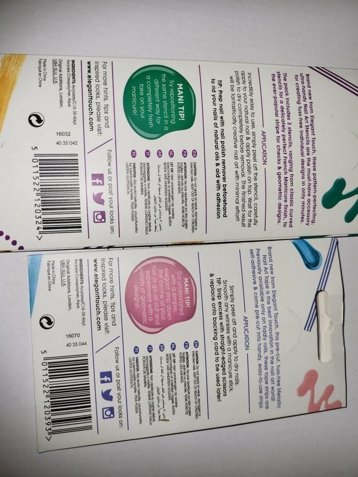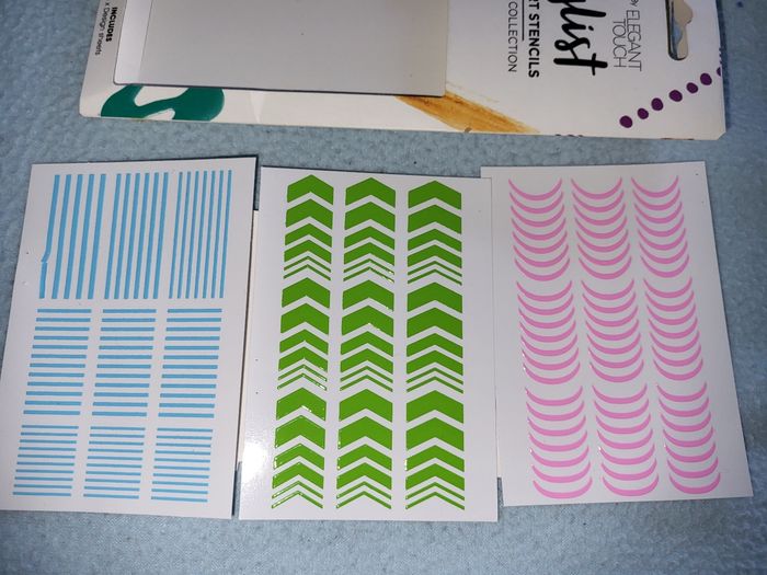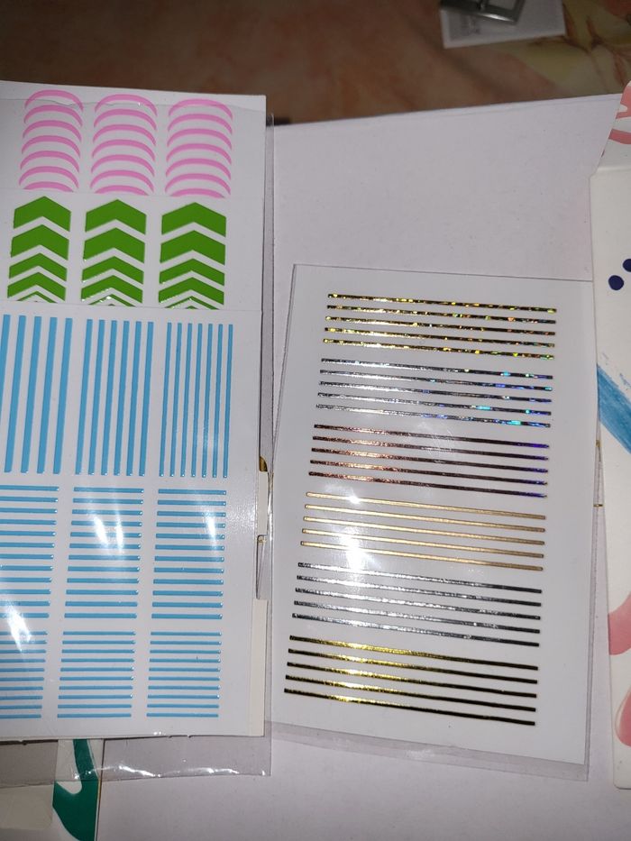 Lot de 4 planches de 10 cm .pour nail art .rose .vert .bleu et une de argent, or et cuivre de chez monoprix ELEGANT TOUCH NEUF NON UTILISE, 3 euro piece le paquet