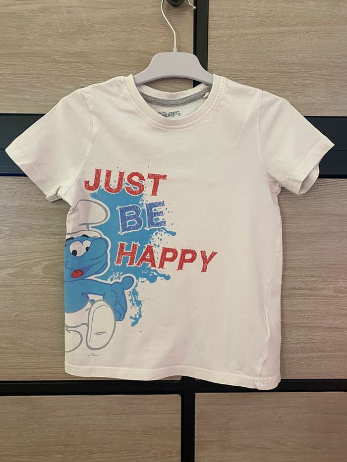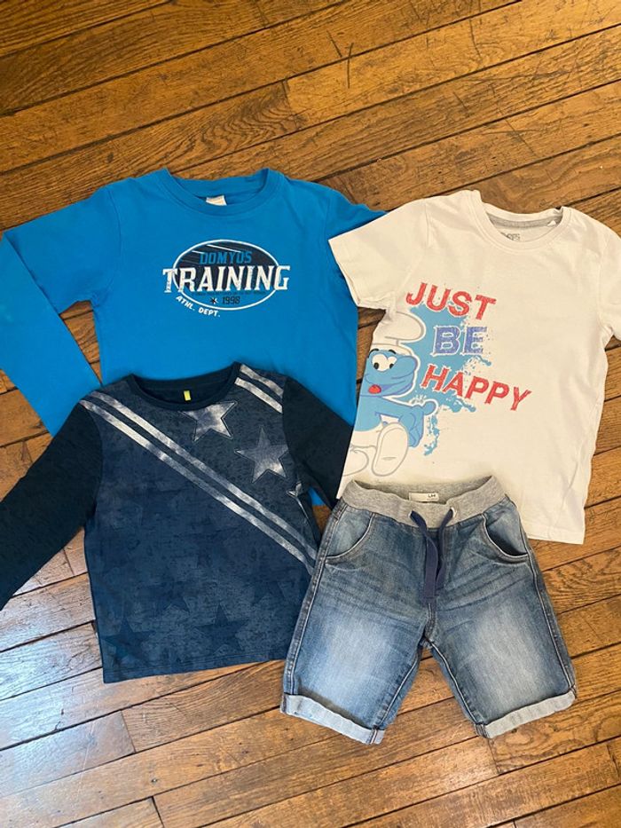 Lot short et t-shirts Taille 5 ans - t-shirt blanc, les Schtroumpfs, coton, très joli, oversize, une micro tache sur le bas devant (cf photo) - t-shirt bleu nuit Orchestra, étiquette 6 ans mais taille petit donc équivalent plutôt à un 5 ans Excellent état, manches longues - short en coton LH by La Halle, style Jeans très sympa ! Taille élastique très pratique pour l’enfilage des petits, 2 poches avant, petite tache sur la fesse gauche et un point de couture fait (cf photo) - t-shirt Domyos Training bleu manches longues offert ! Car petit problème de lavages sur les bras et usure du temps …