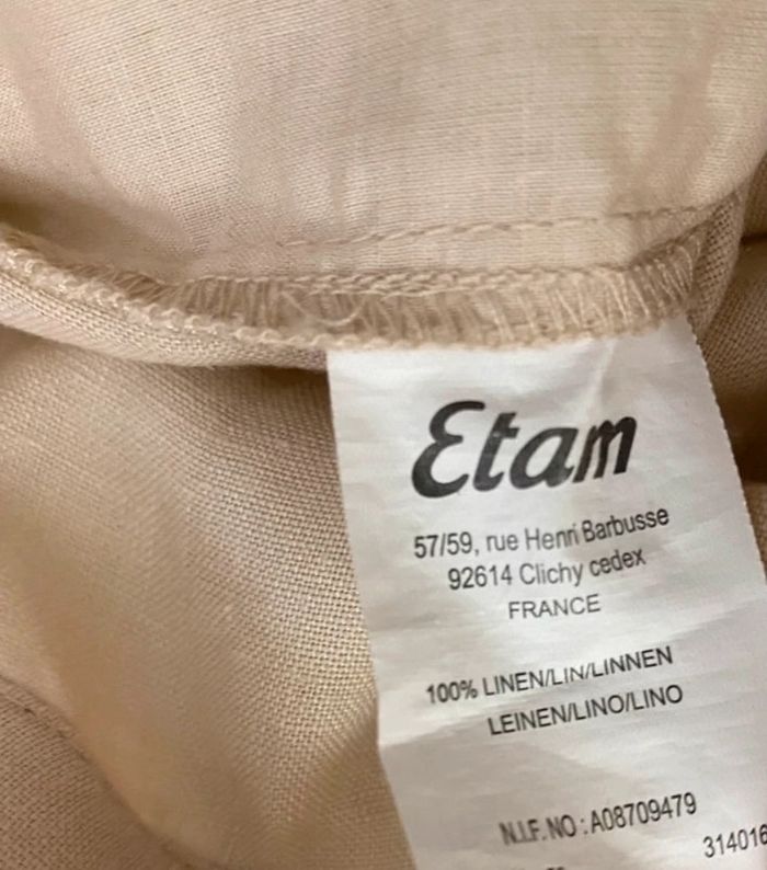 Pantalon léger Etam taille 36/38 100% lin Agréable à porter Quelques petites taches sur la braguette et sur l’arrière au niveau de l’assise (cf photos) Longueur jambe : 89 cm Longueur entrejambe : 66 cm Taille 80,5 cm (non élastique)