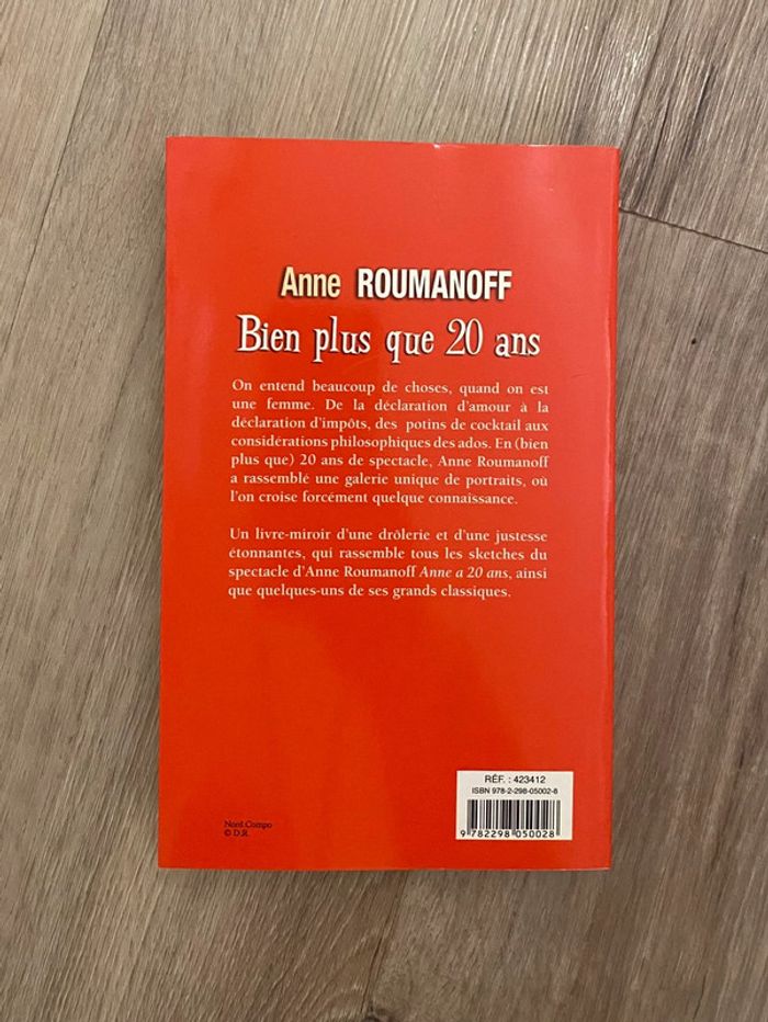 Livre d’Anne Roumanoff Bien plus que 20 ans Portraits de femmes et d’un homme Livre de 217 pages qui rassemble tous les sketches du spectacle d’Anne Roumanoff « Bien plus que 20 ans » ainsi que certains de ses grands classiques. Drôle et sympa à lire ! Un bon divertissement
