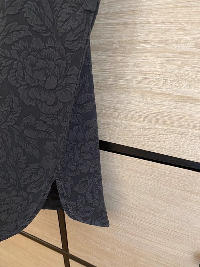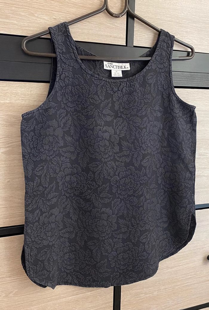 Top très joli SANCTISILK Taille M 100 % soie Échancré sur les côtés Fleurs incrustés dans le tissu