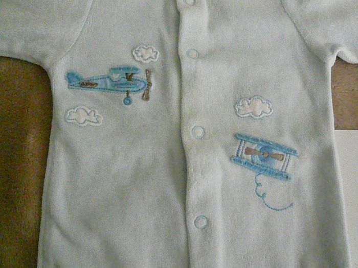Pyjama en velours - couleur bleu à motif avion. Taille 1 mois. Très bon état. N’hésitez pas à regarder mes autres annonces pour réduire les frais de port.