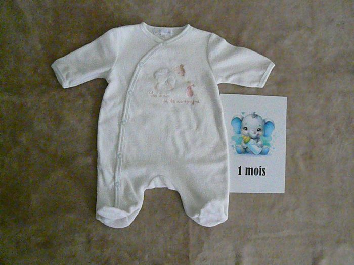 Pyjama en velours – couleur blanc à motif mouton. Taille 1 mois. Très bon état. N’hésitez pas à regarder mes autres annonces pour réduire les frais de port.