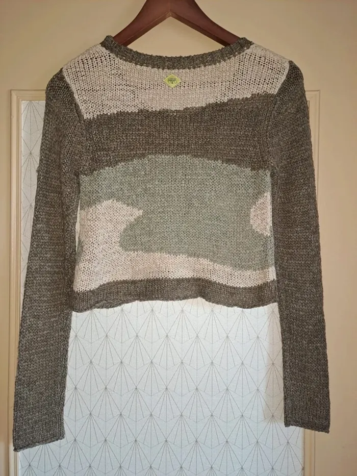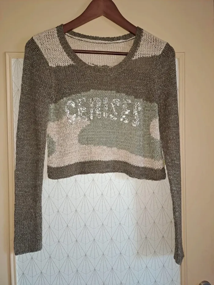 Magnifique pull court femme S étiquette coupée le temps des cerises 🍒 comme neuf kaki beige sequins
