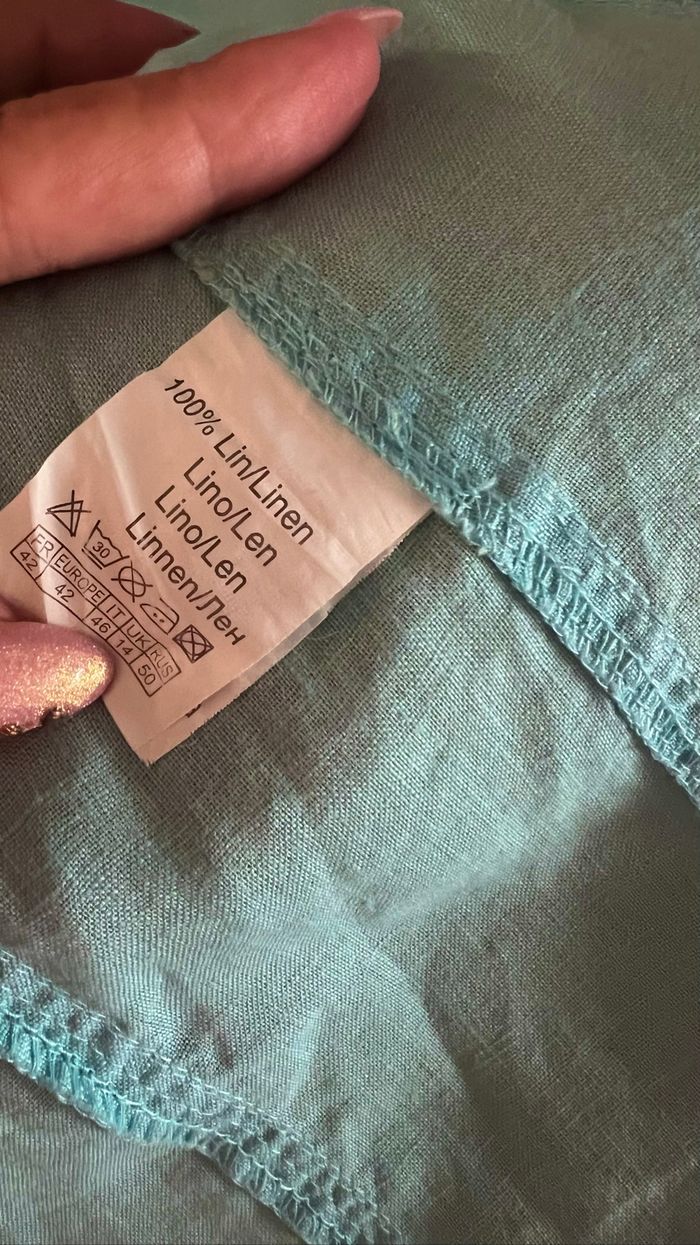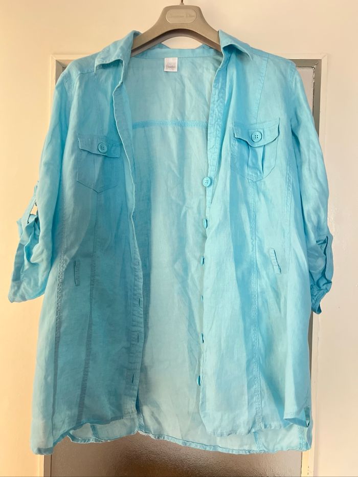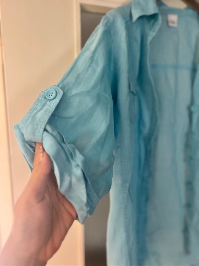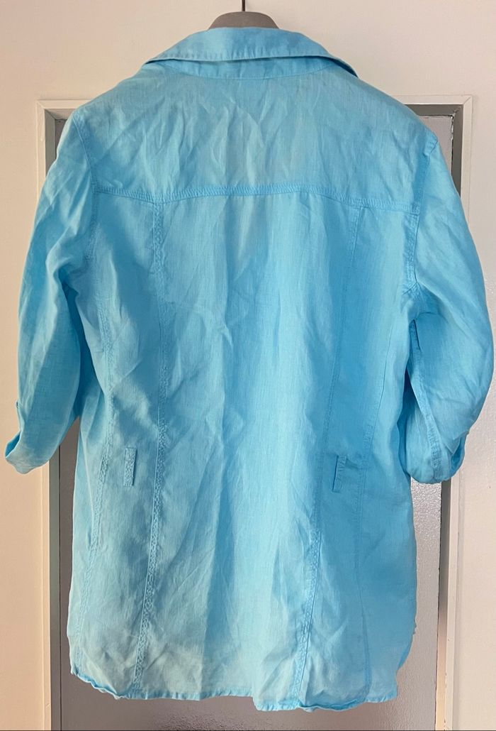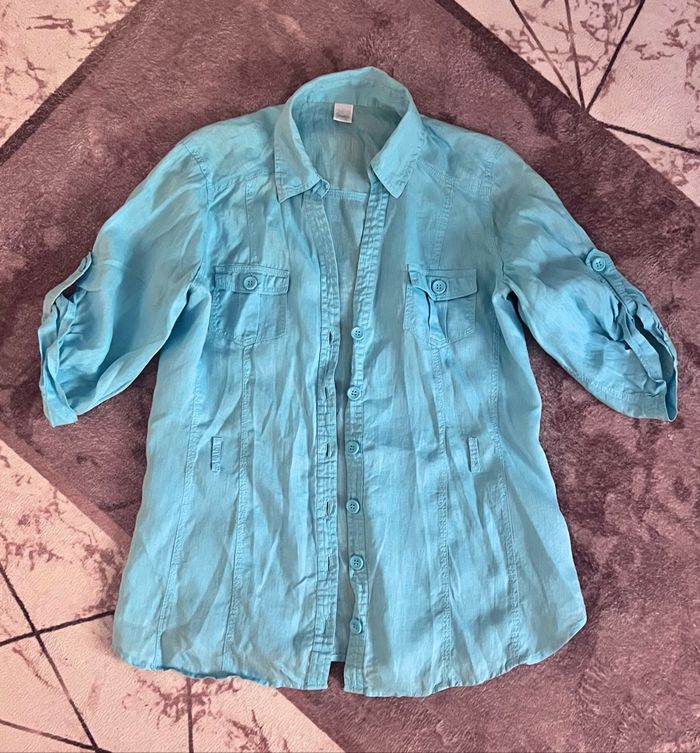 Chemise 100 % lin Camaieu Coloris turquoise bleu Taille 42 Très agréable pour l'été Gros boutons devant Bouton de rechange Manches 3/4 Deux poches devant Sans ceinture 📩Je réponds rapidement aux messages 📦Envoi rapide et soigné