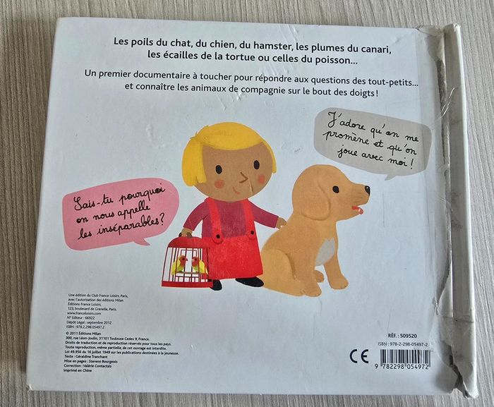 Livre mes animaux familiers à toucher. L'intérieur est en très bon état mais la couverture est à scotcher. Éventuellement à donner si vous prenez plus de 5 livres.