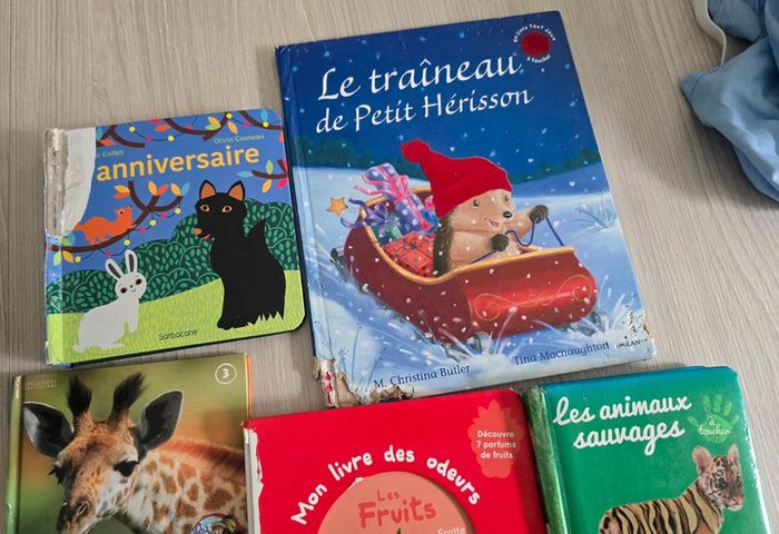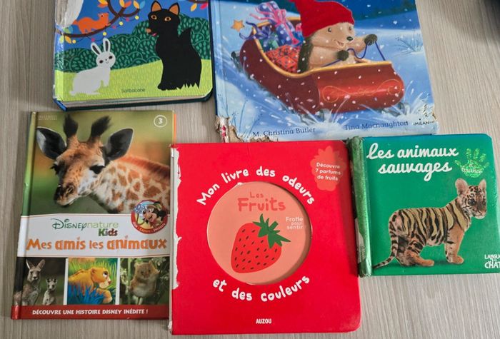 Lot de 5 livres. Le livre sur les animaux tout à gauche, est comme neuf. Les autres présentent des traces d'usure au niveau de la couverture mais l'intérieur est en très bon état. D'où le petit prix.