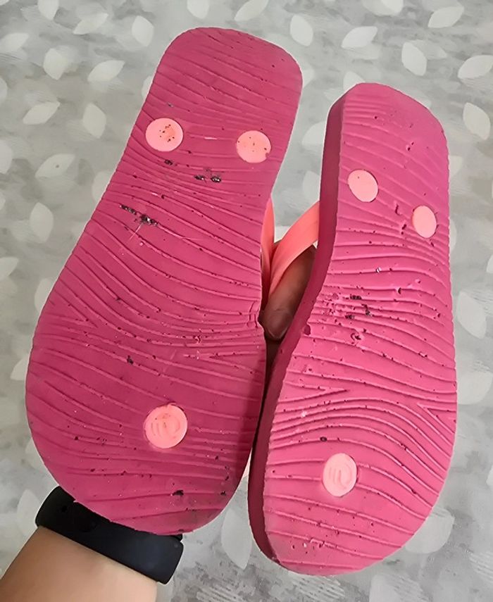 Tongs rose taille 27 28. Très bon état mis à part quelques traces au niveau de la semelle, peu portées.