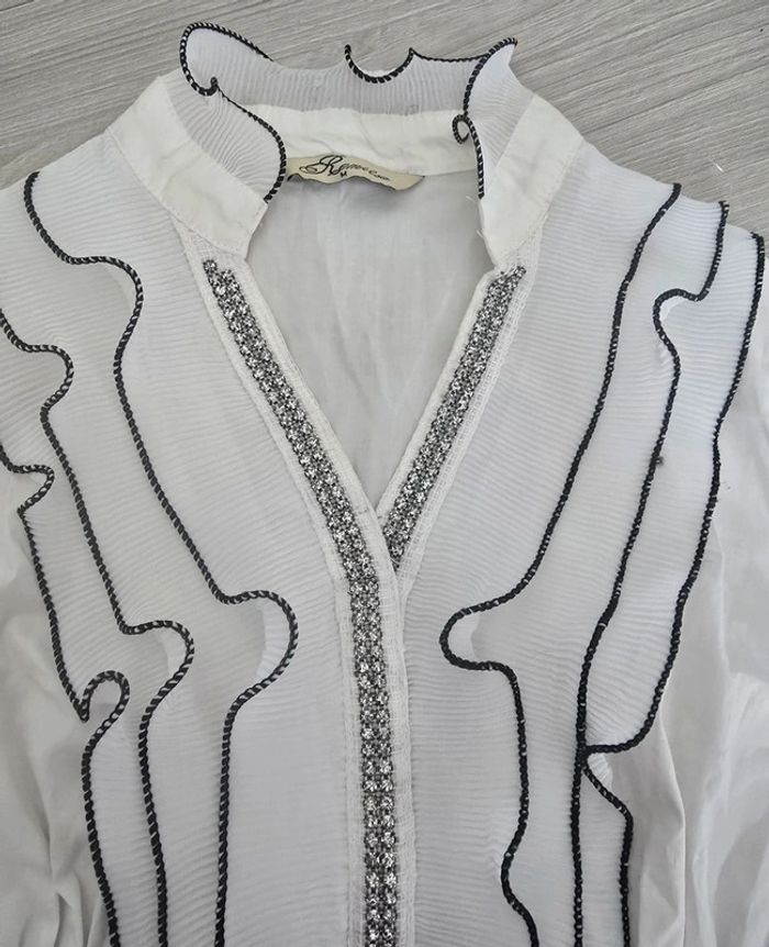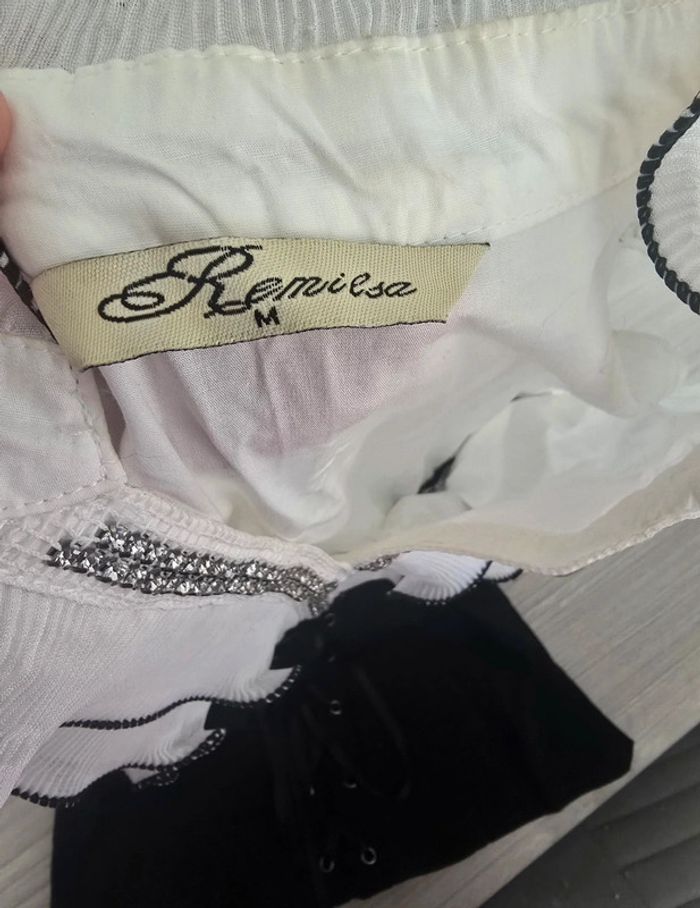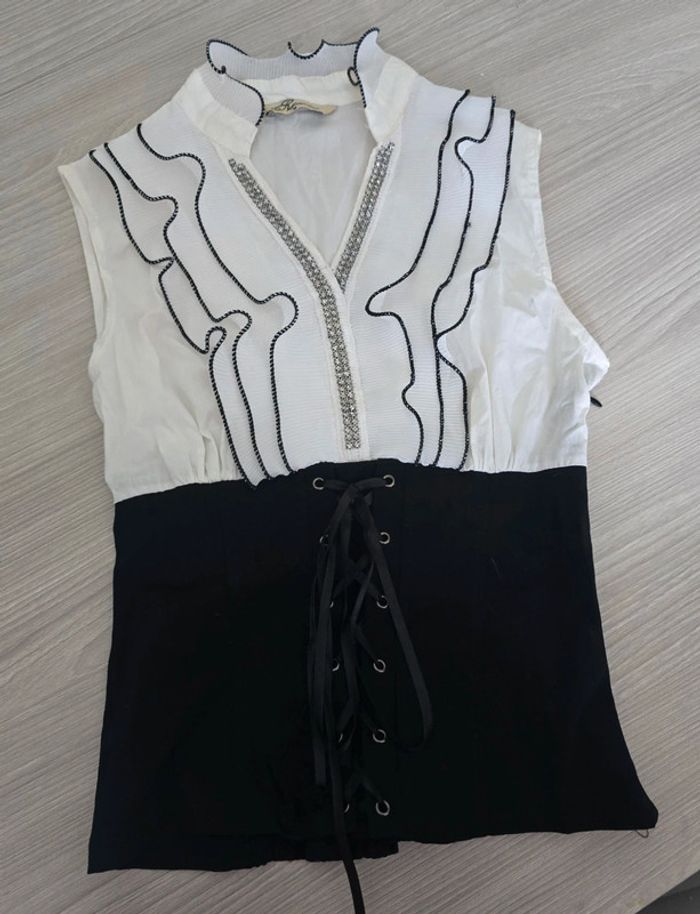 Petit haut noir et blanc avec froufrous et corset. Très bon état, légère coloration à l'intérieur du col. Taille M